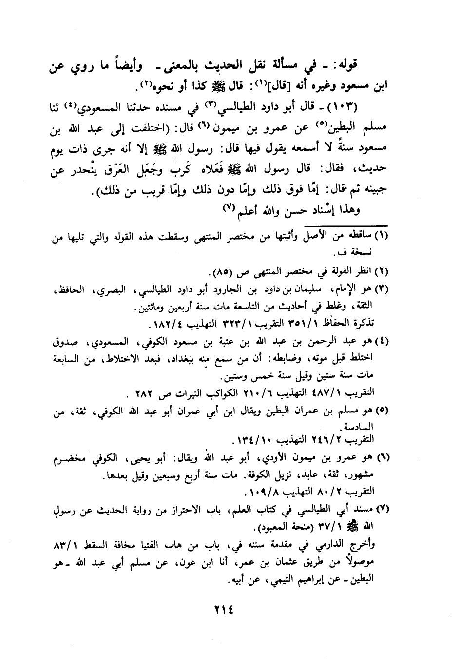 (103) قَالَ أَبُو دَاوُد الطَّيَالِسِيّ فِي مُسْنده حَدثنَا المَسْعُودِيّ ثَنَا مُسلم البطين عَن عَمْرو بن مَيْمُون قَالَ اخْتلفت إِلَى عبد الله بن مَسْعُود سنة لَا أسمعهُ يَقُول فِيهَا قَالَ رَسُول الله صَلَّى اللَّهُ عَلَيْهِ وَسَلَّم َ إِلَّا أَنه جَرَى ذَات يَوْم حَدِيث فَقَالَ قَالَ رَسُول الله صَلَّى اللَّهُ عَلَيْهِ وَسَلَّم َ فعلاه كرب وَجعل الْعرق ينحدر عَن جَبينه ثمَّ قَالَ إِمَّا فَوق ذَلِك وَإِمَّا دون ذَلِك وَإِمَّا قريب من ذَلِك وَهَذَا إِسْنَاد حسن وَالله أعلم
