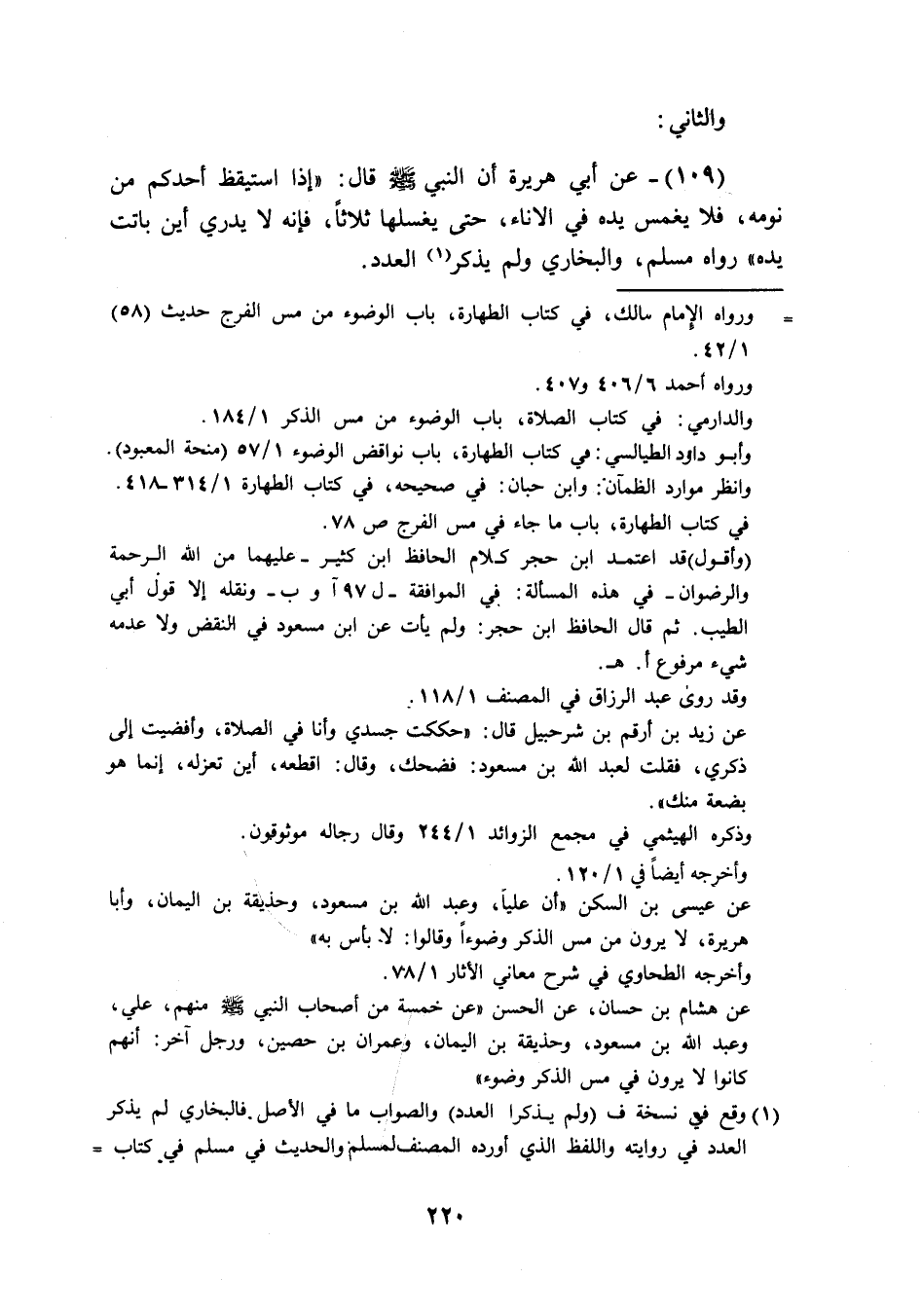 (109) عَن ابي هُرَيْرَة أَن النَّبِي صَلَّى اللَّهُ عَلَيْهِ وَسَلَّم َ قَالَ إِذا اسْتَيْقَظَ أحدكُم من نَومه فَلَا يغمس يَده فِي الاناء حَتَّى يغسلهَا ثَلَاثًا فَإِنَّهُ لَا يدْرِي ايْنَ باتت يَده رَوَاهُ مُسلم وَالْبُخَارِيّ وَلم يذكر الْعدَد