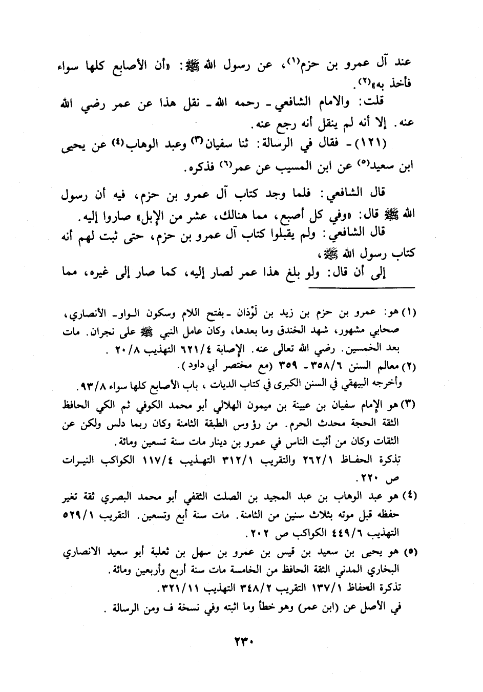 (121) فَقَالَ فِي الرسَالَة ثَنَا سُفْيَان وَعبد الْوَهَّاب عَن يحي ابْن سعيد عَن ابْن الْمسيب عَن عمر فَذكره قَالَ الشَّافِعِي فَلَمَّا وجد كتاب آل عَمْرو بن حزم فِيهِ أَن رَسُول الله صَلَّى اللَّهُ عَلَيْهِ وَسَلَّم َ قَالَ وَفِي كل اصبع مِمَّا هُنَالك عشر من الابل صَارُوا إِلَيْهِ قَالَ الشَّافِعِي وَلم يقبلُوا كتاب آل عَمْرو بن حزم حَتَّى ثَبت لَهُم أَنه كتاب رَسُول الله صَلَّى اللَّهُ عَلَيْهِ وَسَلَّم َ إِلَى أَن قَالَ وَلَو بلغ هَذَا عمر لصار إِلَيْهِ كَمَا صَار إِلَى غَيره مِمَّا