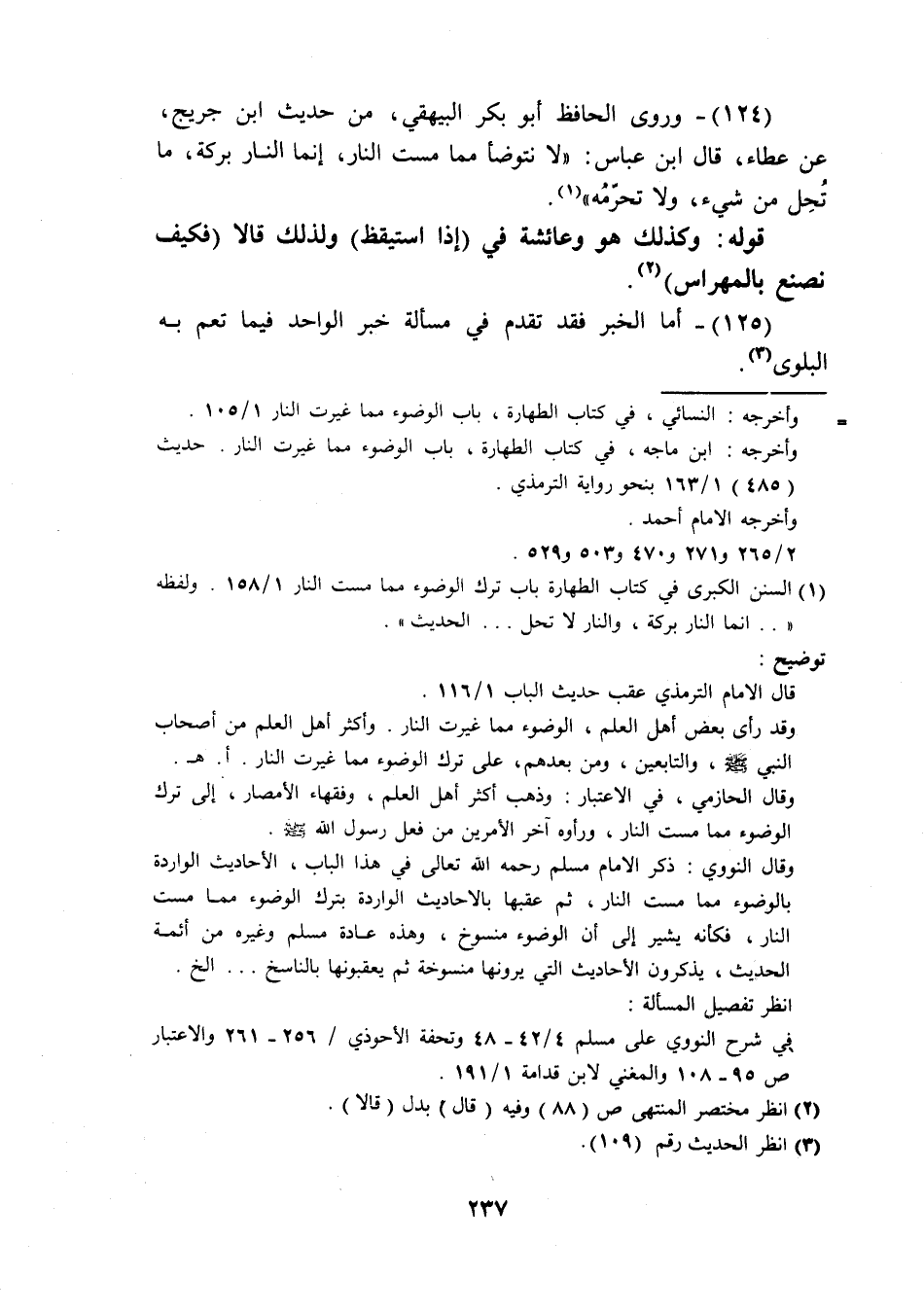 (124) وَرَوَى الْحَافِظ أَبُو بكر الْبَيْهَقِيّ من حَدِيث ابْن جريج عَن عَطاء قَالَ ابْن عَبَّاس لَا نَتَوَضَّأ مِمَّا مست النَّار إِنَّمَا النَّار بركَة مَا تحل من شَيْء وَلَا تحرمه