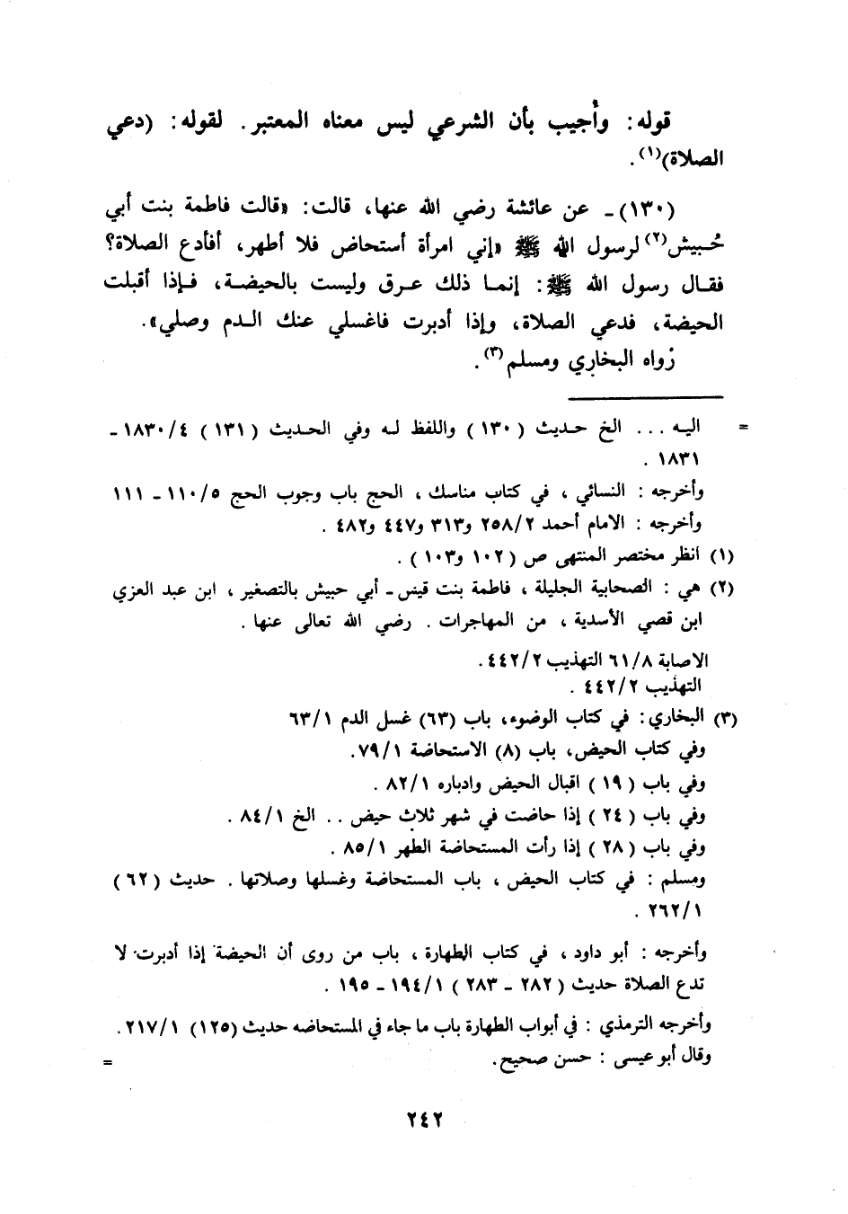 (130) عَن عَائِشَة رَضِيَ اللَّهُ عَنْها قَالَت قَالَت فَاطِمَة بنت أبي حُبَيْش لرَسُول صَلَّى اللَّهُ عَلَيْهِ وَسَلَّم َ إِنِّي امْرَأَة أسْتَحَاض فَلَا أطهر افأدع الصَّلَاة ففال رَسُول الله صَلَّى اللَّهُ عَلَيْهِ وَسَلَّم َ إِنَّمَا ذَلِك عرق وَلَيْسَ بالحيضة فَإِذا أَقبلت الْحَيْضَة فدعي الصَّلَاة وَإِذا أَدْبَرت فاغسلي عَنْك الدَّم وَصلي رَوَاهُ البُخَارِيّ وَمُسلم
