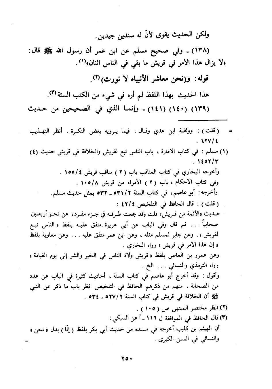 (138) وَفِي صَحِيح مُسلم عَن ابْن عمر أَن رَسُول الله صَلَّى اللَّهُ عَلَيْهِ وَسَلَّم َ قَالَ لَا يزَال هَذَا الْأَمر فِي قُرَيْش مَا بَقِي فِي النَّاس اثْنَان