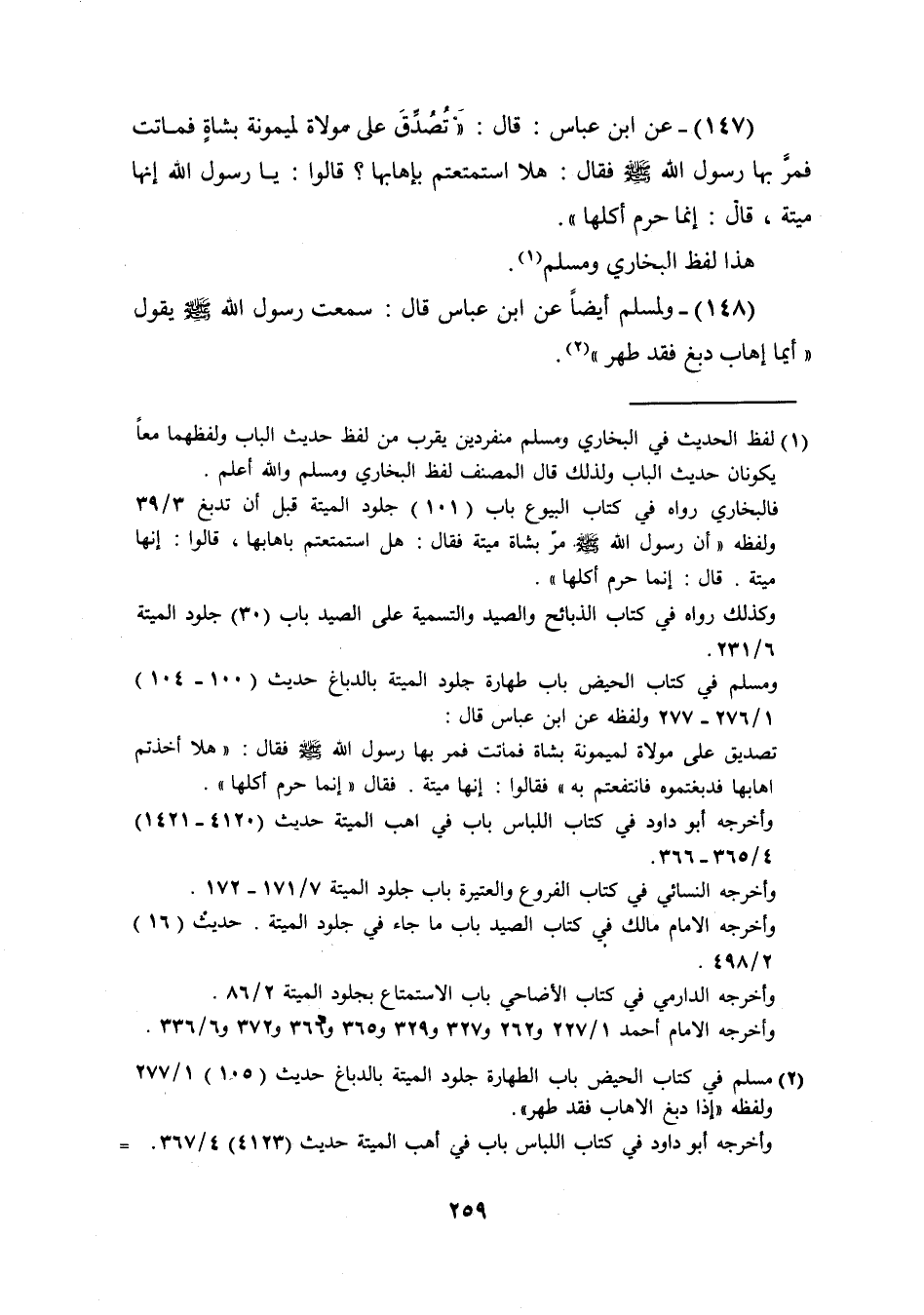 (147) عَن ابْن عَبَّاس قَالَ تصدق عَلَى مولاة لميمونة بِشَاة فَمَاتَتْ فَمر بهَا رَسُول الله صَلَّى اللَّهُ عَلَيْهِ وَسَلَّم َ فَقَالَ هلا استمتعتم بإهابها قَالُوا يَا رَسُول الله إِنَّهَا ميتَة قَالَ إِنَّمَا حرم أكلهَا هَذَا لفظ البُخَارِيّ وَمُسلم