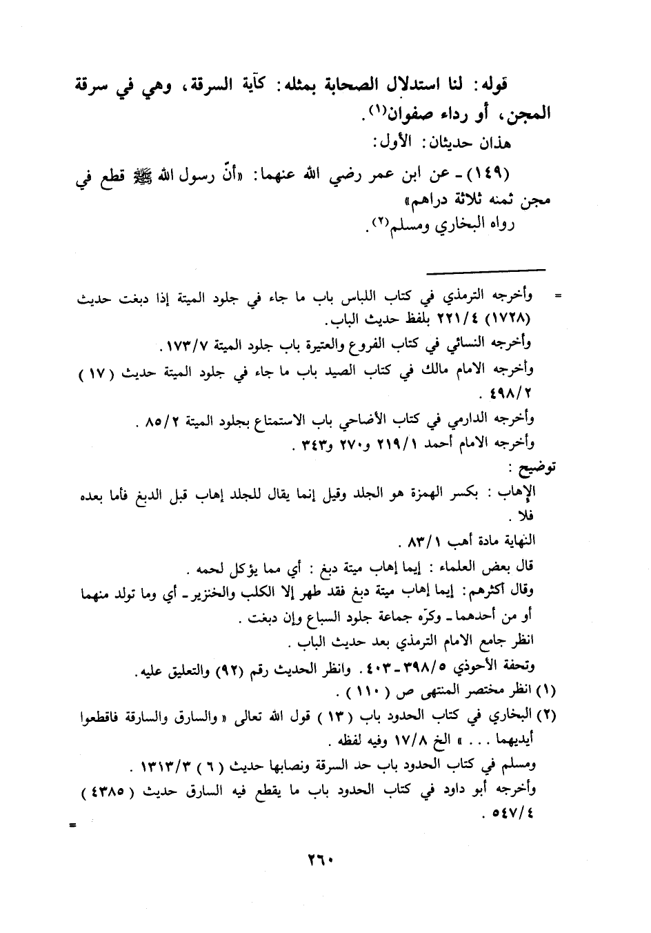 (149) عَن ابْن عمر رَضِيَ اللَّهُ عَنْهما أَن رَسُول الله صَلَّى اللَّهُ عَلَيْهِ وَسَلَّم َ قطع فِي مجن ثمنه ثَلَاثَة دَرَاهِم رَوَاهُ البُخَارِيّ وَمُسلم