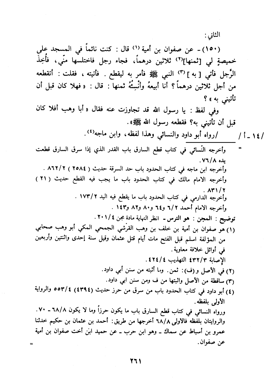 الثَّانِي (150) عَن صَفْوَان بن أُميَّة قَالَ كنت نَائِما فِي الْمَسْجِد عَلَى حميصة لي ثمنهَا ثَلَاثِينَ درهما فجَاء رجل فاختلسها مني فَأخذ الرجل فَأَتَى بِهِ النَّبِي صَلَّى اللَّهُ عَلَيْهِ وَسَلَّم َ فَأمر بِهِ ليقطع فَأَتَيْته فَقلت أتقطعه من أجل ثَلَاثِينَ درهما أَنا أبيعه وأنسئه ثمنهَا قَالَ فَهَلا كَانَ قبل أَن تَأتِينِي بِهِ