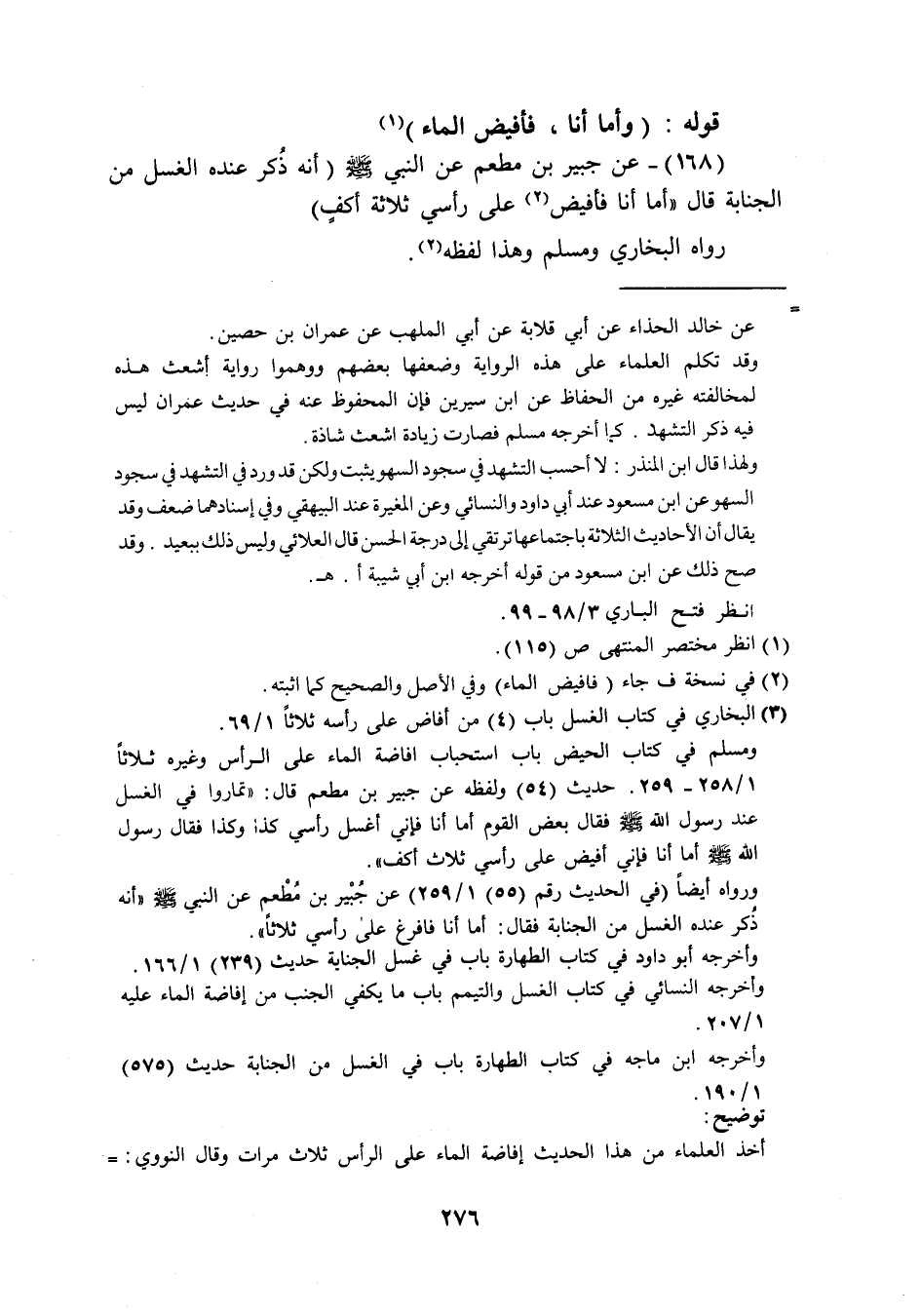 (168) عَن جُبَير بن مطعم عَن النَّبِي صَلَّى اللَّهُ عَلَيْهِ وَسَلَّم َ أَنه ذكر عِنْده الْغسْل من الْجَنَابَة قَالَ أما أَنا فافيض عَلَى رَأْسِي ثَلَاثَة أكف رَوَاهُ البُخَارِيّ وَمُسلم وَهَذَا لَفظه