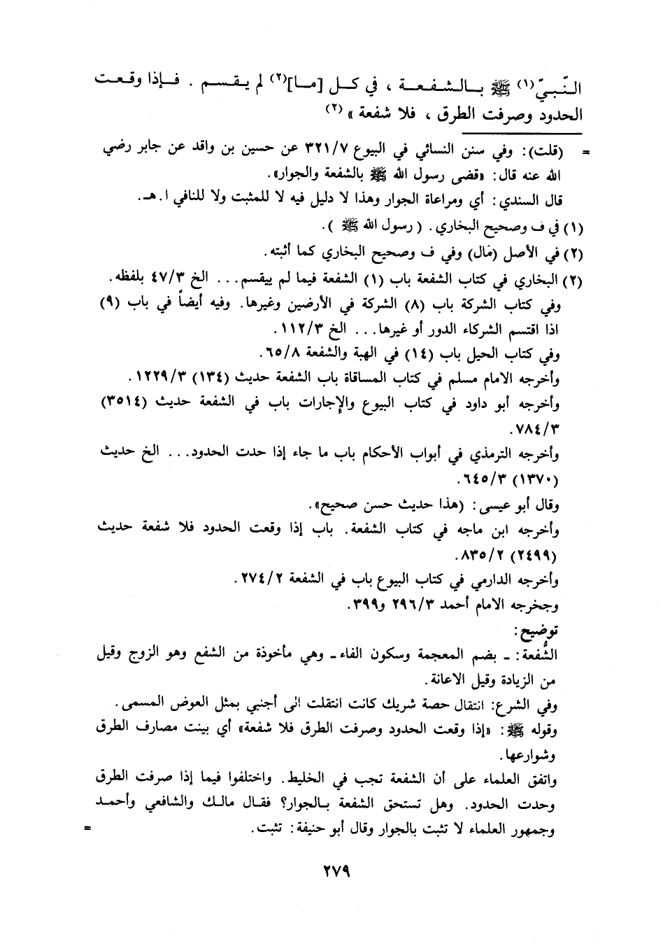 النَّبِي صَلَّى اللَّهُ عَلَيْهِ وَسَلَّم َ بِالشُّفْعَة فِي كل مَا لم يقسم فَإِذا وَقعت الْحُدُود وصرفت الطّرق فَلَا شُفْعَة