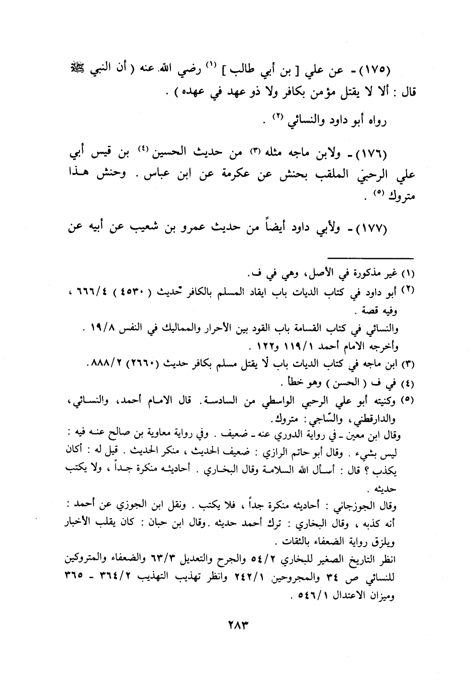 (175) عَن عَلّي بن أبي طَالب رَضِيَ اللَّهُ عَنْه أَن النَّبِي صَلَّى اللَّهُ عَلَيْهِ وَسَلَّم َ قَالَ أَلا لَا يقتل مُؤمن بِكَافِر وَلَا دو عهد فِي عَهده وَرَوَاهُ أَبُو دَاوُد وَالنَّسَائِيّ