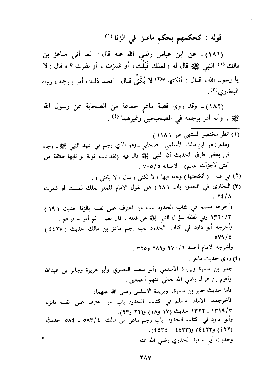 (182) وَقد رَوَى قصَّة مَاعِز جمَاعَة من الصَّحَابَة عَن رَسُول الله صَلَّى اللَّهُ عَلَيْهِ وَسَلَّم َ وَأَنه أَمر برجمه فِي الصَّحِيحَيْنِ وَغَيرهمَا