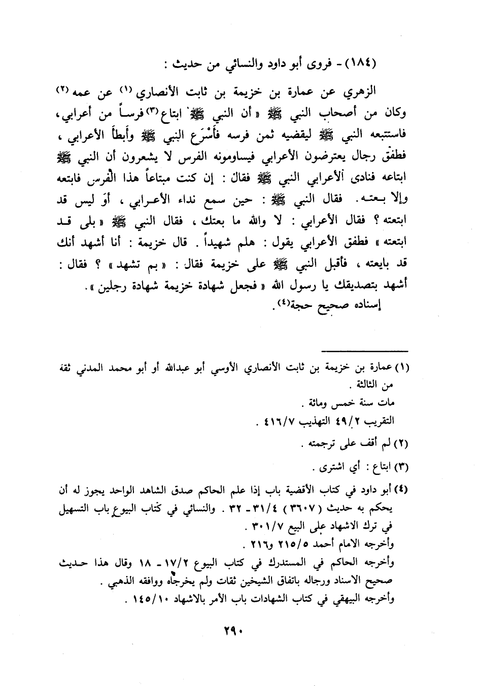 (184) فروَى ابو دَاوُد وَالنَّسَائِيّ من حَدِيث الزُّهْرِيّ عَن عمَارَة بن خُزَيْمَة بن ثَابت الانصاري عَن عَمه وَكَانَ من أَصْحَاب النَّبِي صَلَّى اللَّهُ عَلَيْهِ وَسَلَّم َ أَن النَّبِي صَلَّى اللَّهُ عَلَيْهِ وَسَلَّم َ ا بتاع فرسا من أَعْرَابِي فالستتبعه النَّبِي صَلَّى اللَّهُ عَلَيْهِ وَسَلَّم َ ليقضيه ثمن فرسه فأسرع النَّبِي صَلَّى اللَّهُ عَلَيْهِ وَسَلَّم َ وابطأ الاعرابي فَطَفِقَ رجال يعترضون الاعرابي فيساومونه الْفرس لَا يَشْعُرُونَ أَن النَّبِي صَلَّى اللَّهُ عَلَيْهِ وَسَلَّم َ ابتاعه فَنَادَى الْأَعرَابِي النَّبِي صَلَّى اللَّهُ عَلَيْهِ وَسَلَّم َ فَقَالَ إِن كنت مبتاعا هَذَا الْفرس فابتعه وإلابعته فَقَالَ النَّبِي صَلَّى اللَّهُ عَلَيْهِ وَسَلَّم َ حِين سمع نِدَاء الاعرابي أَو لَيْسَ قد ابتعته فَقَالَ الاعرابي لَا وَالله مَا يعتك فَقَالَ النَّبِي صَلَّى اللَّهُ عَلَيْهِ وَسَلَّم َ بلَى قد ابتعته فَطَفِقَ الاعرابي يَقُول هَلُمَّ شَهِيدا قَالَ خُزَيْمَة أَنا أشهد أَنَّك قد بايعته فاقبل النَّبِي صَلَّى اللَّهُ عَلَيْهِ وَسَلَّم َ عَلَى خُزَيْمَة فَقَالَ بِمَ تشهد فَقَالَ أشهد بتصديقك يَا رَسُول الله فَجعل شَهَادَة خُزَيْمَة شَهَادَة رجلَيْنِ إِسْنَاده صَحِيح حجَّة