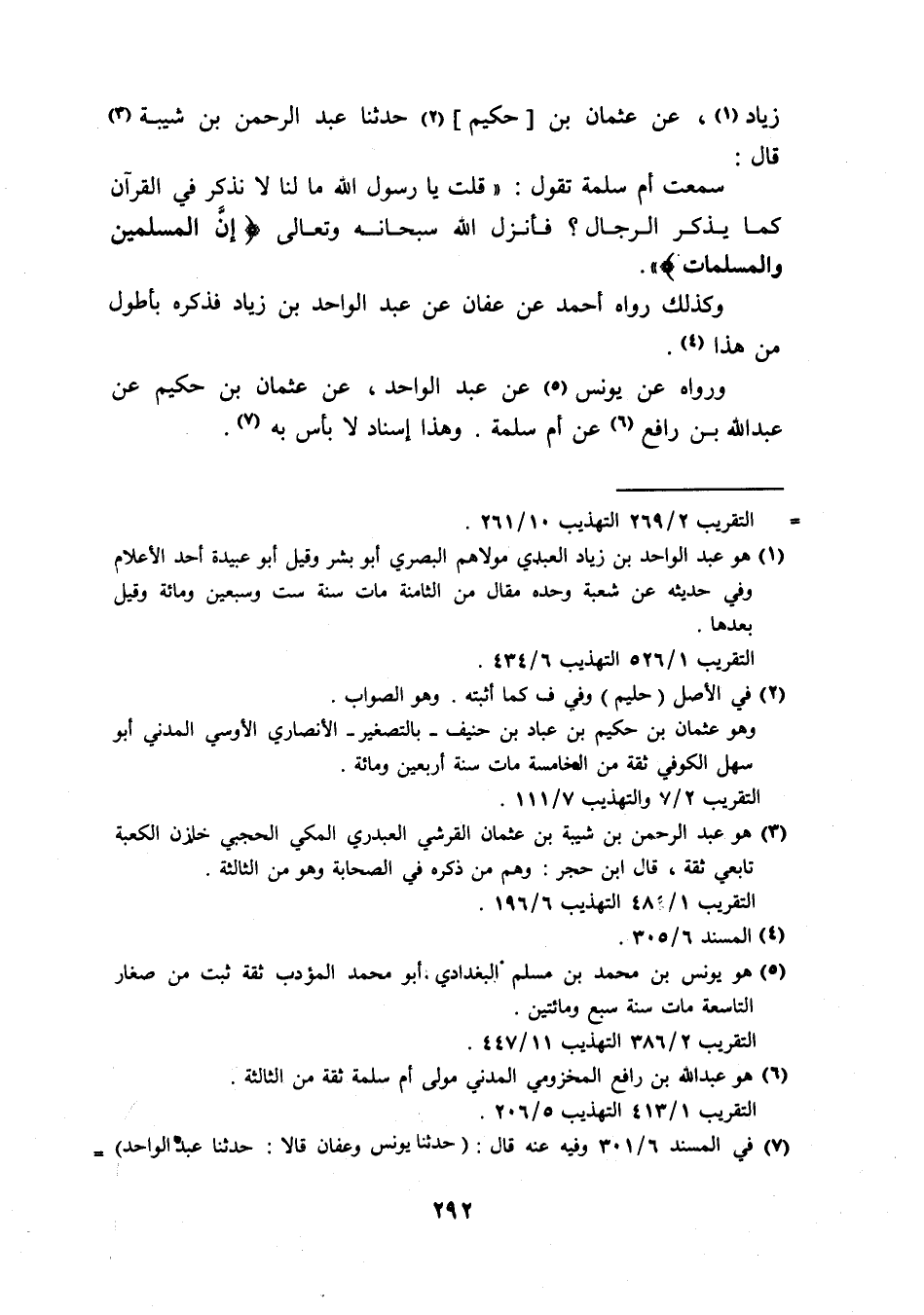 زِيَاد عَن عُثْمَان بن حَكِيم حَدثنَا عبد الرَّحْمَن بن شيبَة قَالَ سَمِعت أم سَلمَة تَقول قلت يَا رَسُول الله مَا لنا لَا نذْكر فِي الْقُرْآن كَمَا يذكر الرِّجَال فَانْزِل الله سُبْحَانَهُ وَتَعَالَى { إِن الْمُسلمين وَالْمُسلمَات } وَكَذَلِكَ رَوَاهُ أَحْمد عَن عَفَّان عَن عبد الْوَاحِد بن زِيَاد فَذكره بأطول من هَذَا وَرَوَاهُ عَن يُونُس عَن عبد الْوَاحِد عَن عُثْمَان بن حَكِيم عَن عبد الله بن رَافع عَن أم سَلمَة وَهَذَا إِسْنَاد لَا باس بِهِ