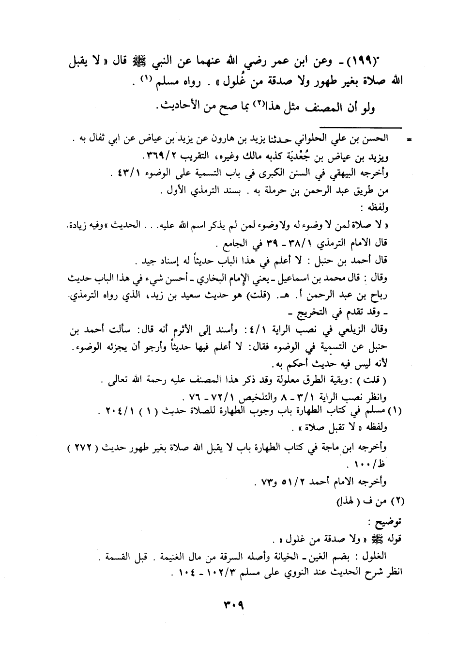 (199) وَعَن ابْن عمر رَضِيَ اللَّهُ عَنْهما عَن النَّبِي صَلَّى اللَّهُ عَلَيْهِ وَسَلَّم َ قَالَ لَا يقبل الله صَلَاة بِغَيْر طهُور وَلَا صَدَقَة من غلُول رَوَاهُ مُسلم وَلَو أَن المُصَنّف مثل هَذَا بِمَا صَحَّ من الاحاديث