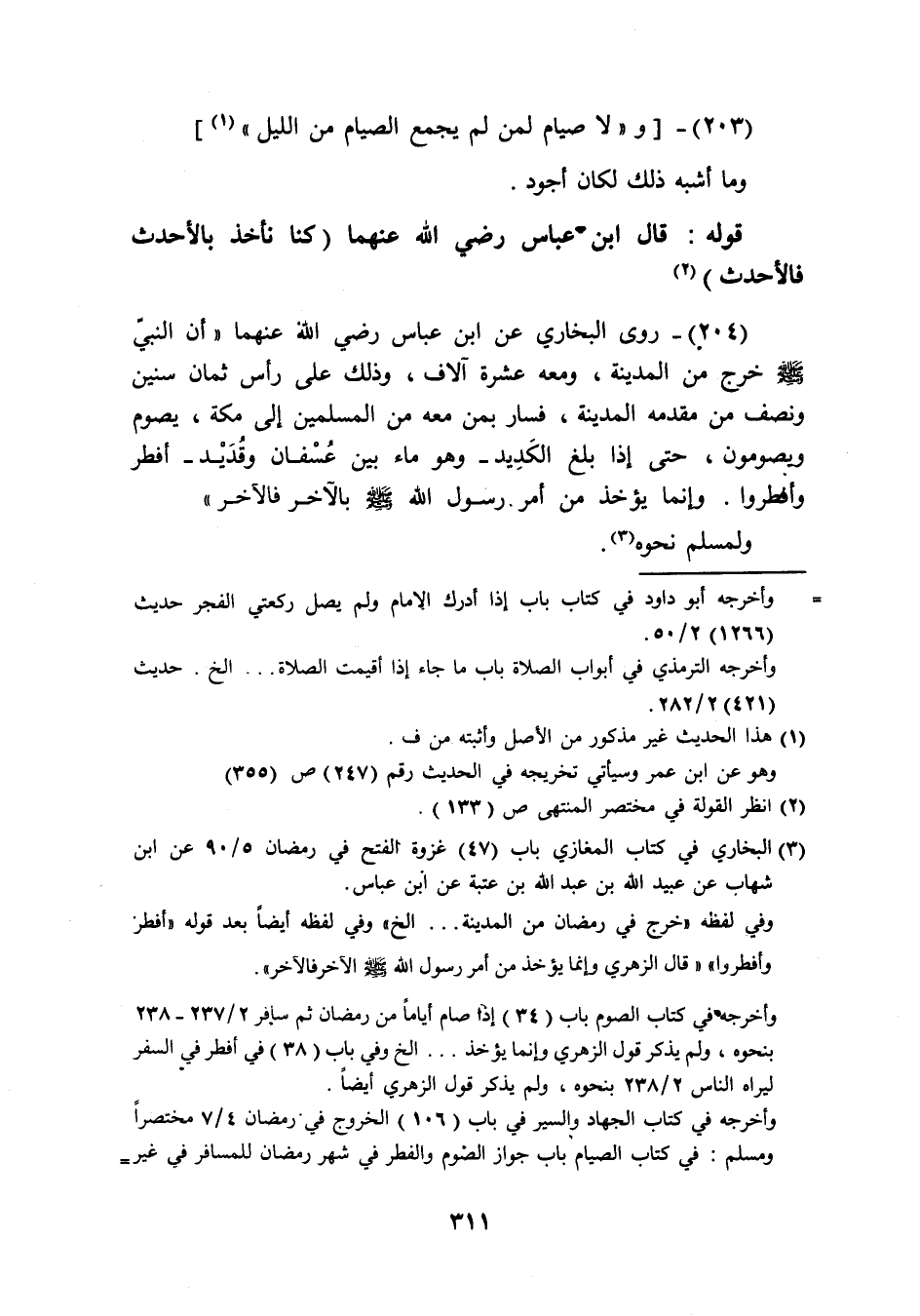 (204) رَوَى البُخَارِيّ عَن ابْن عَبَّاس رَضِيَ اللَّهُ عَنْهما أَن النَّبِي صَلَّى اللَّهُ عَلَيْهِ وَسَلَّم َ خرج من الْمَدِينَة وَمَعَهُ عشرَة الاف وَذَلِكَ عَلَى رَأس ثَمَان سِنِين وَنصف من مُقَدّمَة الْمَدِينَة فَسَار بِمن مَعَه من الْمُسلمين الى مَكَّة يَصُوم وَيَصُومُونَ حَتَّى إِذا بلغ الكديد وَهُوَ مَاء بَين عسفان وقديد أفطر وَافْطرُوا وَإِنَّمَا يُؤْخَذ من أَمر رَسُول الله صَلَّى اللَّهُ عَلَيْهِ وَسَلَّم َ بِالْآخرِ فالآخر وَلمُسلم نَحوه
