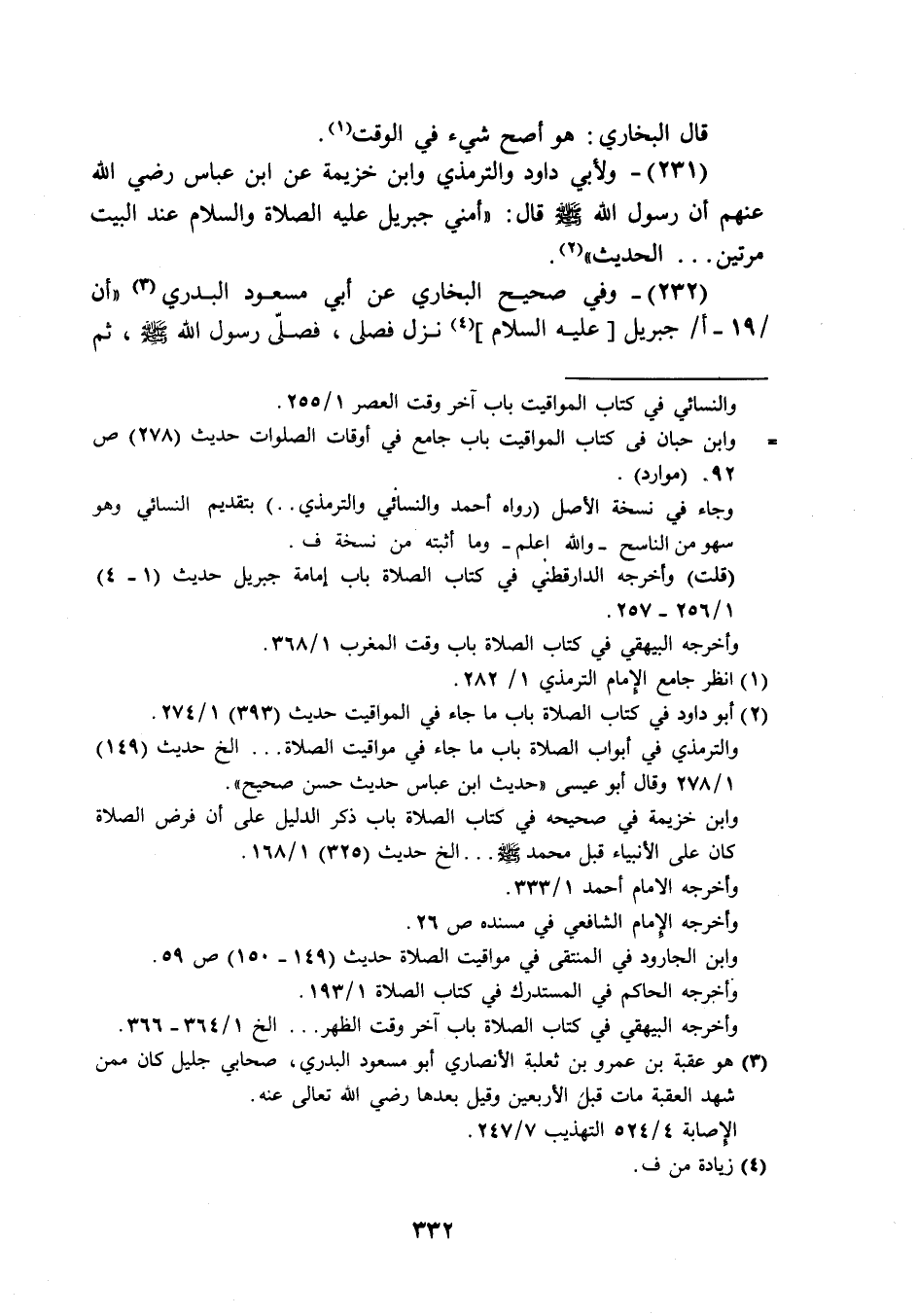 (232) وَفِي صَحِيح البُخَارِيّ عَن أبي مَسْعُود البدري أَن 19 أ جِبْرِيل عَلَيْهِ السَّلَام نزل فَصَلى فَصَلى رَسُول الله صَلَّى اللَّهُ عَلَيْهِ وَسَلَّم َ ثمَّ