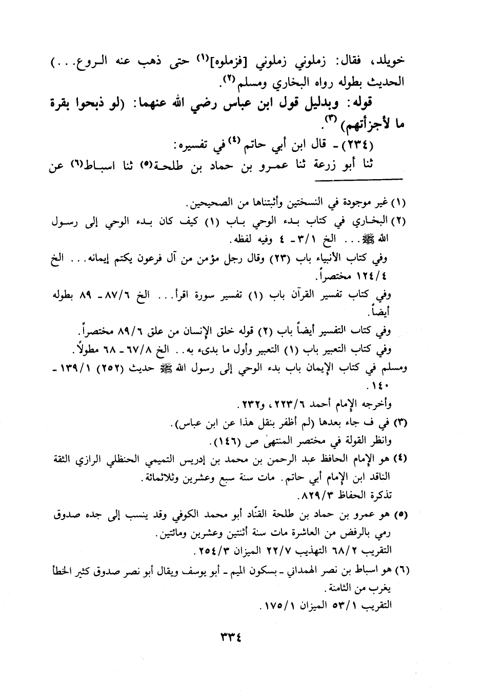 (234) قَالَ ابْن ابي حَاتِم فِي تَفْسِيره ثَنَا ابو زرْعَة ثَنَا عَمْرو بن حَمَّاد بن طَلْحَة ثَنَا اسباط عَن