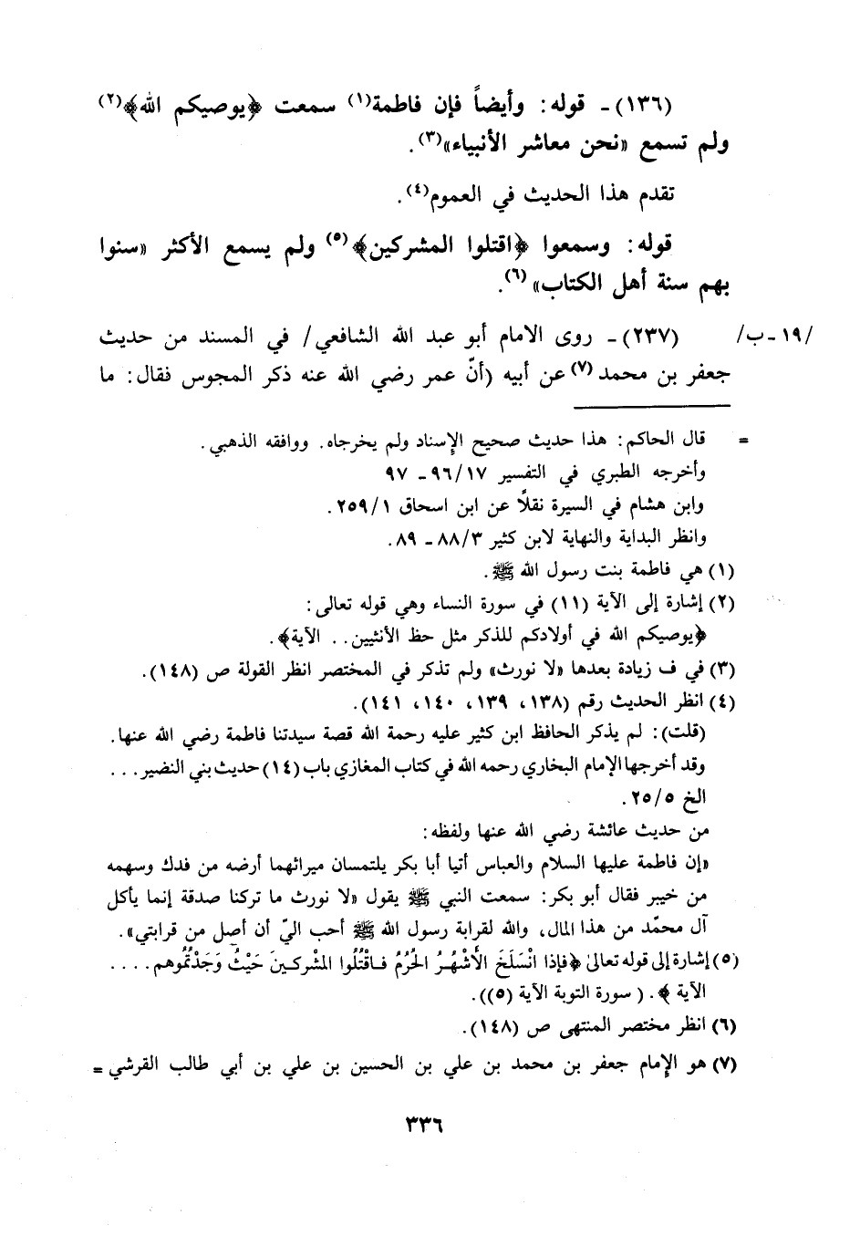 (136) قَوْله وَأَيْضًا فَإِن فَاطِمَة سَمِعت { يُوصِيكُم الله } وَلم تسمع نَحن معاشر الانبياء تقدم هَذَا الحَدِيث فِي الْعُمُوم