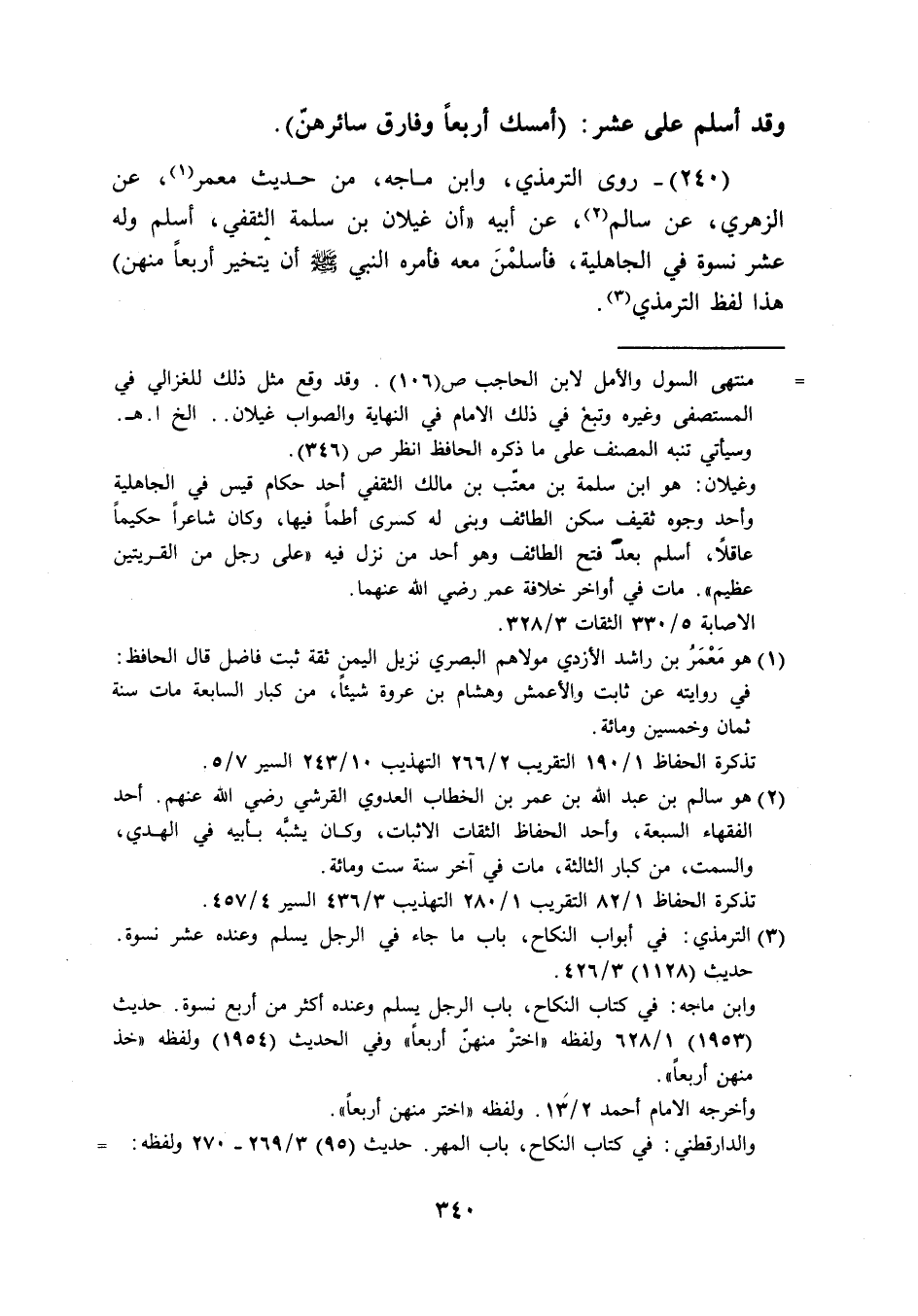 (240) رَوَى التِّرْمِذِيّ وَابْن مَاجَه من حَدِيث معمر عَن الزُّهْرِيّ عَن سَالم عَن ابيه أَن غيلَان بن سَلمَة الثَّقَفِيّ اسْلَمْ وَله عشر نسْوَة فِي الْجَاهِلِيَّة فأسلمن مَعَه فَأمره النَّبِي صَلَّى اللَّهُ عَلَيْهِ وَسَلَّم َ ان يتَخَيَّر أَرْبعا مِنْهُنَّ هَذَا لفظ التِّرْمِذِيّ