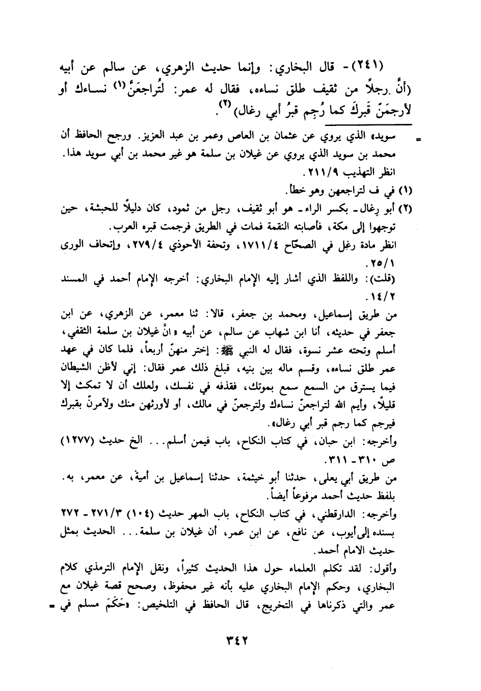 (241) قَالَ البُخَارِيّ وَإِنَّمَا حَدِيث الزُّهْرِيّ عَن سَالم عَن أَبِيه أَن رجلا من ثَقِيف طلق نِسَاءَهُ فَقَالَ لَهُ عمر لتراجعن نِسَاءَك أَو لارجمن قبرك كَمَا رجم قبر أبي رِغَال