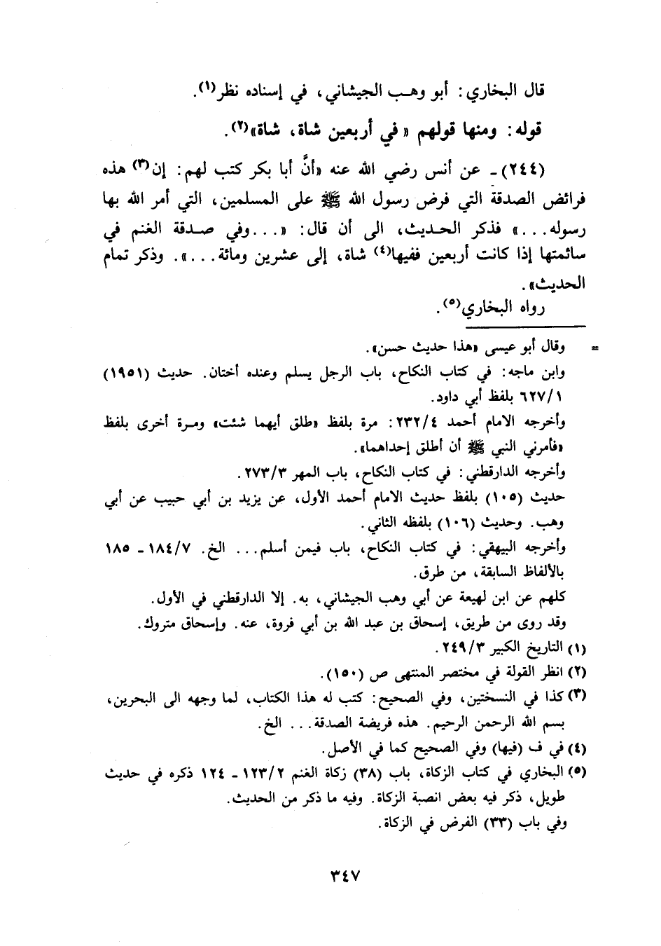 (244) عَن أنس رَضِيَ اللَّهُ عَنْه ان أَبَا بكر كتب لَهُم إِن هَذِه فَرَائض الصَّدَقَة الَّتِي فرض رَسُول الله صَلَّى اللَّهُ عَلَيْهِ وَسَلَّم َ عَلَى الْمُسلمين الَّتِي أَمر الله بهَا رَسُوله فَذكر الحَدِيث الى ان قَالَ وَفِي صَدَقَة الْغنم فِي سائمتها إِذا كَانَت أَرْبَعِينَ فَفِيهَا شَاة إِلَى عشْرين وَمِائَة وَذكر تَمام الحَدِيث رَوَاهُ البُخَارِيّ