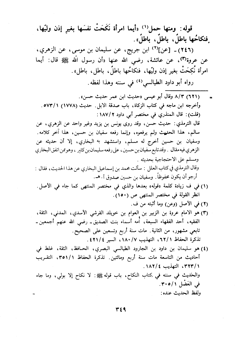(246) عَن ابْن جريج عَن سُلَيْمَان بن مُوسَى عَن الزُّهْرِيّ عَن عُرْوَة عَن عَائِشَة رَضِيَ اللَّهُ عَنْها أَن رَسُول الله صَلَّى اللَّهُ عَلَيْهِ وَسَلَّم َ قَالَ أَيّمَا أمْرَأَة نكحت بِغَيْر إِذن وَليهَا فنكاحها بَاطِل بَاطِل بَاطِل رَوَاهُ أَبُو دَاوُد الطَّيَالِسِيّ فِي سنَنه وَهَذَا لَفظه