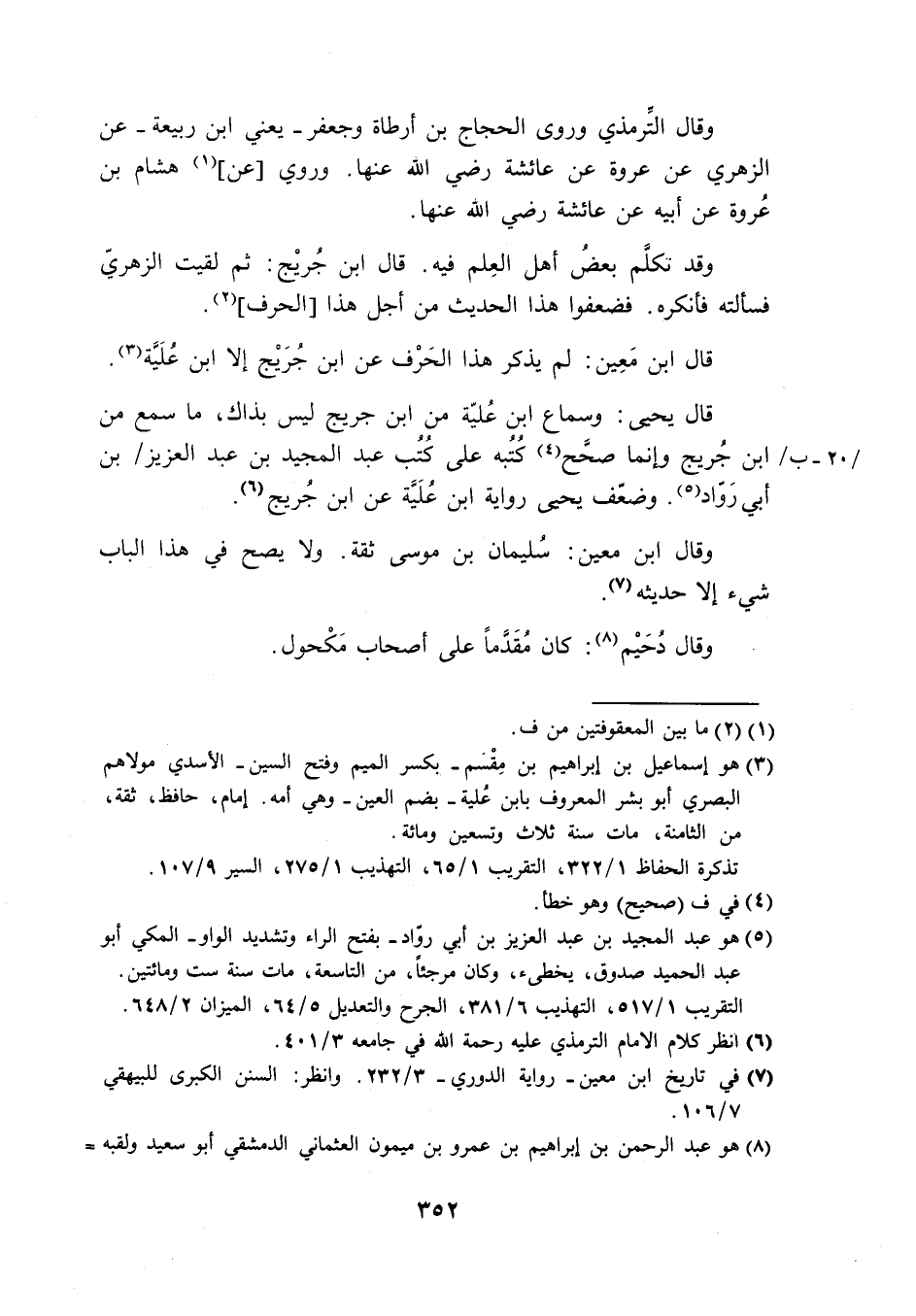 قَالَ يحي وَسَمَاع ابْن عَلَيْهِ من ابْن جريج لَيْسَ بِذَاكَ مَا سمع من 20 ب ابْن جريج وَإِنَّمَا صحّح كتبه عَلَى كتب عبد الْمجِيد بن عبد الْعَزِيز بن ابي رواد وَضعف يحي رِوَايَة ابْن علية عَن ابْن جريج