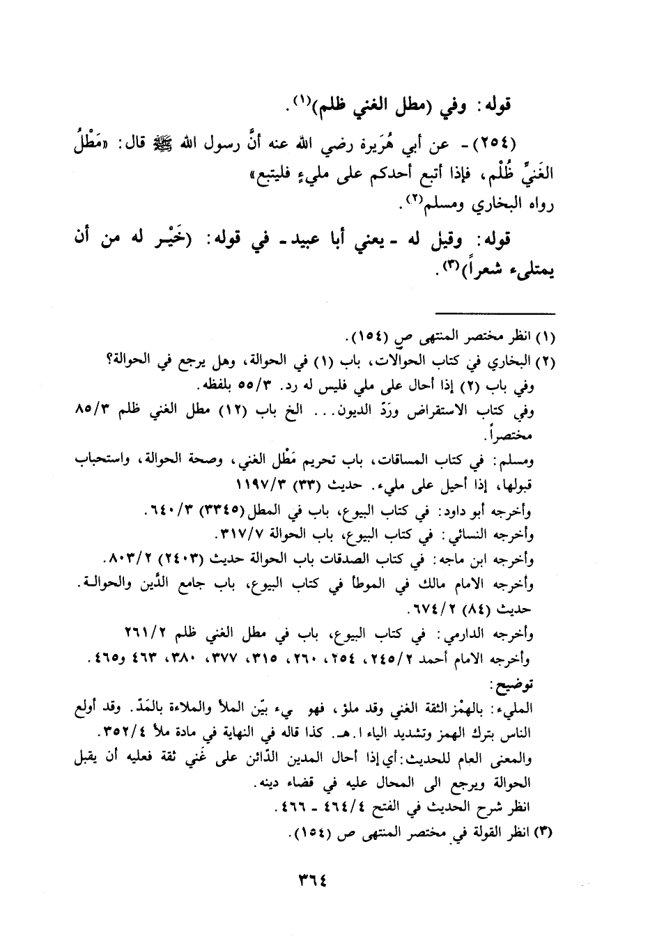 (254) عَن أبي هُرَيْرَة رَضِيَ اللَّهُ عَنْه أَن رَسُول الله صَلَّى اللَّهُ عَلَيْهِ وَسَلَّم َ قَالَ مطل الْغَنِيّ ظلم فَإِذا أتبع أحدكُم عَلَى مَلِيء فَليتبعْ رَوَاهُ البُخَارِيّ وَمُسلم