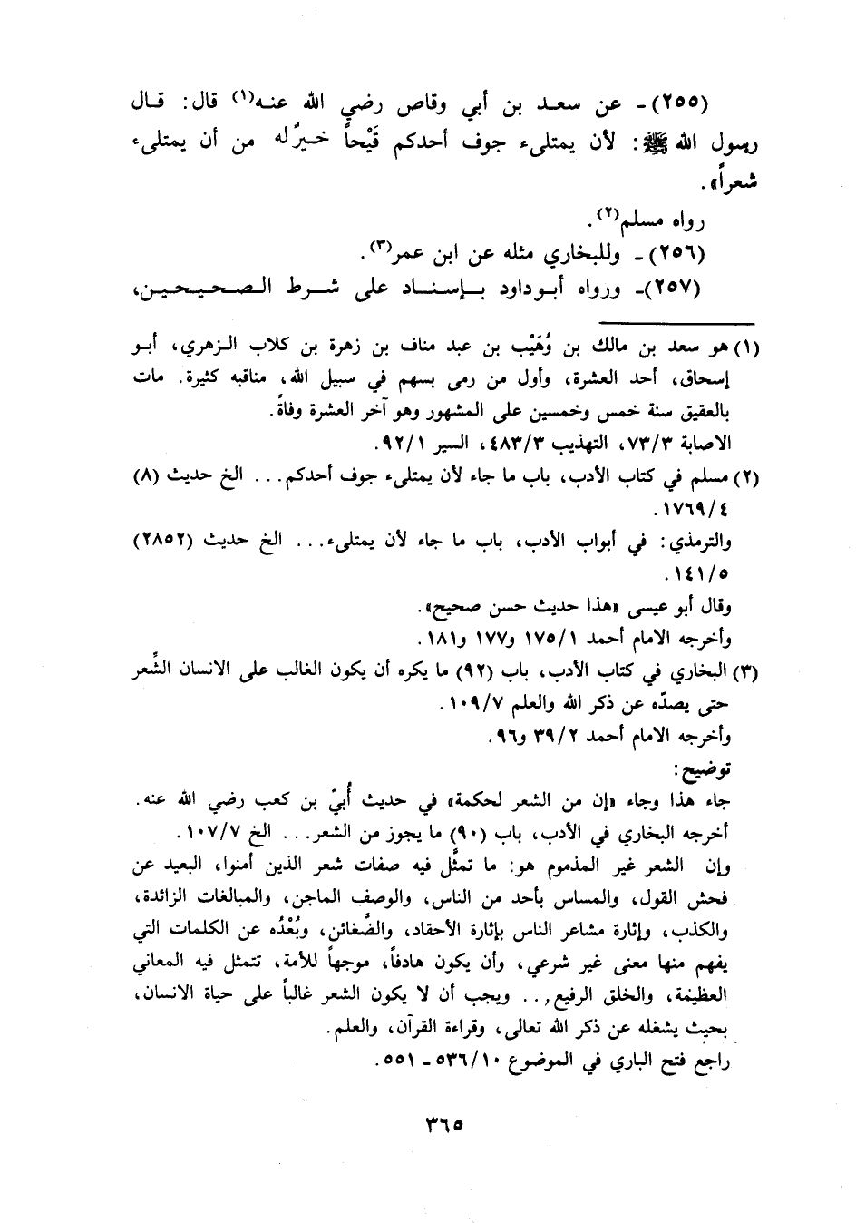 (255) عَن سعد بن أبي وَقاص رَضِيَ اللَّهُ عَنْه قَالَ قَالَ رَسُول الله صَلَّى اللَّهُ عَلَيْهِ وَسَلَّم َ للأن يمتلىء جَوف أحدكُم قَيْحا خير لَهُ من أَن يمتلىء شعرًا رَوَاهُ مُسلم