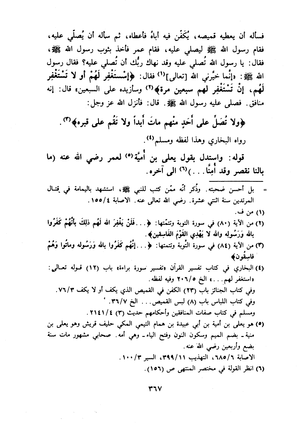 فَسَأَلَهُ أَن يُعْطِيهِ قَمِيصه يُكفن فِيهِ أَبَاهُ فَأعْطَاهُ ثمَّ سَأَلَهُ أَن يُصَلِّي عَلَيْهِ فَقَامَ رَسُول الله صَلَّى اللَّهُ عَلَيْهِ وَسَلَّم َ ليُصَلِّي عَلَيْهِ فَقَامَ عمر فَأخذ بِثَوْب رَسُول الله صَلَّى اللَّهُ عَلَيْهِ وَسَلَّم َ فَقَالَ يَا رَسُول الله تصلي عَلَيْهِ وَقد نهاك رَبك أَن تصلي عَلَيْهِ فَقَالَ رَسُول الله صَلَّى اللَّهُ عَلَيْهِ وَسَلَّم َ إِنَّمَا خيرني الله تَعَالَى فَقَالَ { اسْتغْفر لَهُم أَو لَا تستغفر لَهُم إِن تستغفر لَهُم سبعين مرّة } وسأزيده عَلَى السّبْعين قَالَ إِنَّه مُنَافِق فَصَلى عَلَيْهِ رَسُول الله صَلَّى اللَّهُ عَلَيْهِ وَسَلَّم َ قَالَ فَأنْزل الله عَزَّ وَجَلَّ { وَلَا تصل عَلَى أحد مِنْهُم مَاتَ أبدا وَلَا تقم عَلَى قَبره } رَوَاهُ البُخَارِيّ وَهَذَا لَفظه وَمُسلم