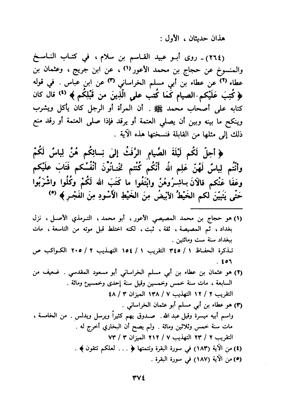 (264) رَوَى أَبُو عبيد الْقَاسِم بن سَلام فِي كتاب النَّاسِخ والمنسوخ عَن حجاج بن مُحَمَّد الْأَعْوَر عَن ابْن جريج وَعُثْمَان بن عَطاء عَن عَطاء بن أبي مُسلم الْخُرَاسَانِي عَن ابْن عَبَّاس فِي قَوْله { كتب عَلَيْكُم الصّيام كَمَا كتب عَلَى الَّذين من قبلكُمْ } قَالَ كَانَ كِتَابه عَلَى أَصْحَاب مُحَمَّد صَلَّى اللَّهُ عَلَيْهِ وَسَلَّم َ أَن الْمَرْأَة أَو الرجل كَانَ يَأْكُل وَيشْرب وينكح مَا بَينه وَبَين أَن صَلَّى الْعَتَمَة أَو يرقد فَإِذا صَلَّى العتمه أَو رقد منع ذَلِك إِلَى مثلهَا من الْقَابِلَة فنسختها هَذِه الْآيَة { أحل لكم لَيْلَة الصّيام الرَّفَث إِلَى نِسَائِكُم هن لِبَاس لكم وَأَنْتُم لِبَاس لَهُنَّ علم الله أَنكُمْ كُنْتُم تختانون أَنفسكُم فَتَابَ عَلَيْكُم وَعَفا عَنْكُم فَالْآن باشروهن وابتغوا مَا كتب الله لكم وكلوا وَاشْرَبُوا حَتَّى يتَبَيَّن لكم الْخَيط الْأَبْيَض من الْخَيط الْأسود من الْفجْر }