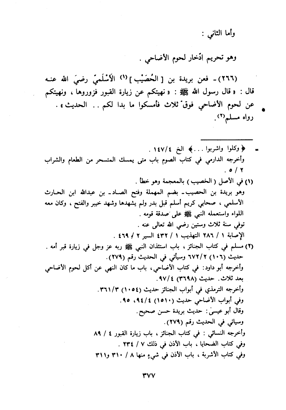 (266) فَعَن بُرَيْدَة بن الْحصيب الاسلمي رَضِيَ اللَّهُ عَنْه قَالَ قَالَ رَسُول الله صَلَّى اللَّهُ عَلَيْهِ وَسَلَّم َ نَهَيْتُكُمْ عَن زياره الْقُبُور فزوروها ونهيتكم عَن لُحُوم الاضاحي فَوق ثَلَاث فأمسكوا مَا بدا لكم الحَدِيث رَوَاهُ مُسلم