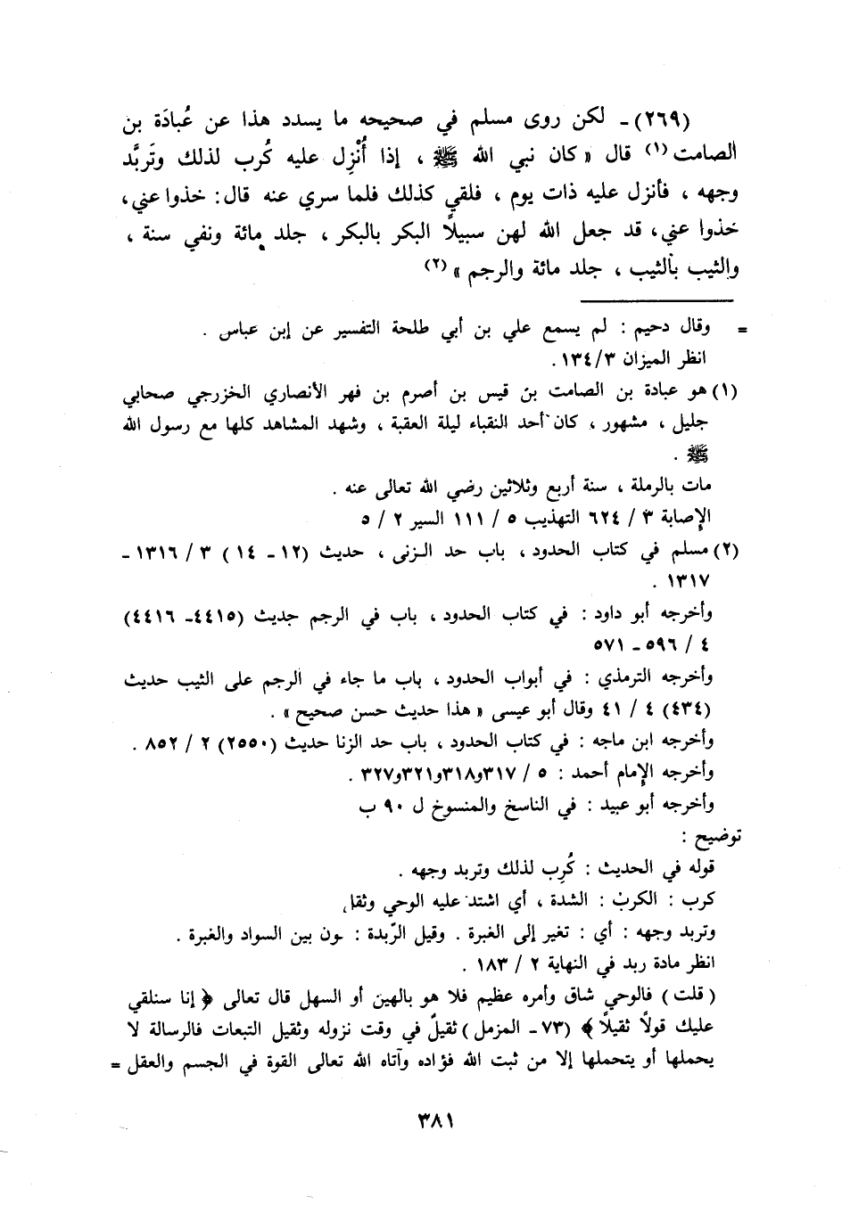 (269) لَكِن رَوَى مُسلم فِي صَحِيحه مَا يسدد هَذَا عَن عبَادَة بن الصَّامِت قَالَ كَانَ نَبِي الله صَلَّى اللَّهُ عَلَيْهِ وَسَلَّم َ إِذا انْزِلْ عَلَيْهِ كرب لذَلِك وَتَربد وَجهه فَأنْزل عَلَيْهِ ذَات يَوْم فلقي كَذَلِك فَلَمَّا سري عَنهُ قَالَ خُذُوا عني خُذُوا عني قد جعل الله لَهُنَّ سَبِيلا الْبكر بالبكر جلد مائَة ونقي سنة وَالثَّيِّب بِالثَّيِّبِ جلد مائَة وَالرَّجم