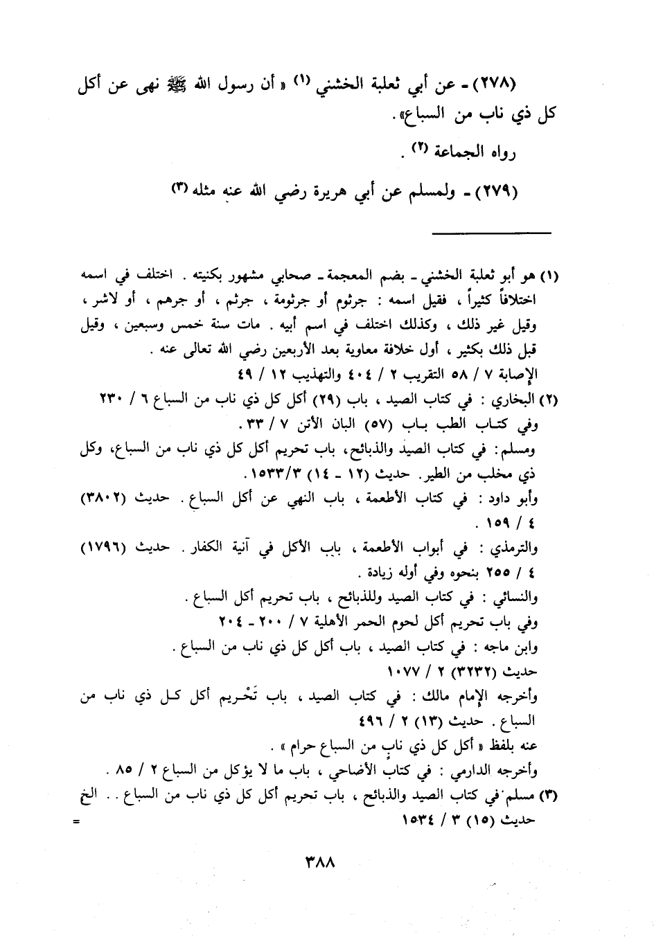 (278) عَن أبي ثَعْلَبَة الْخُشَنِي أَن رَسُول الله صَلَّى اللَّهُ عَلَيْهِ وَسَلَّم َ نهَى عَن أكل كل ذِي نَاب من السبَاع رَوَاهُ الْجَمَاعَة