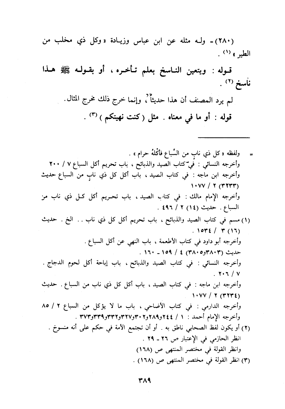 (280) وَله مثله عَن ابْن عَبَّاس وَزِيَادَة وكل ذِي مخلب من الطير