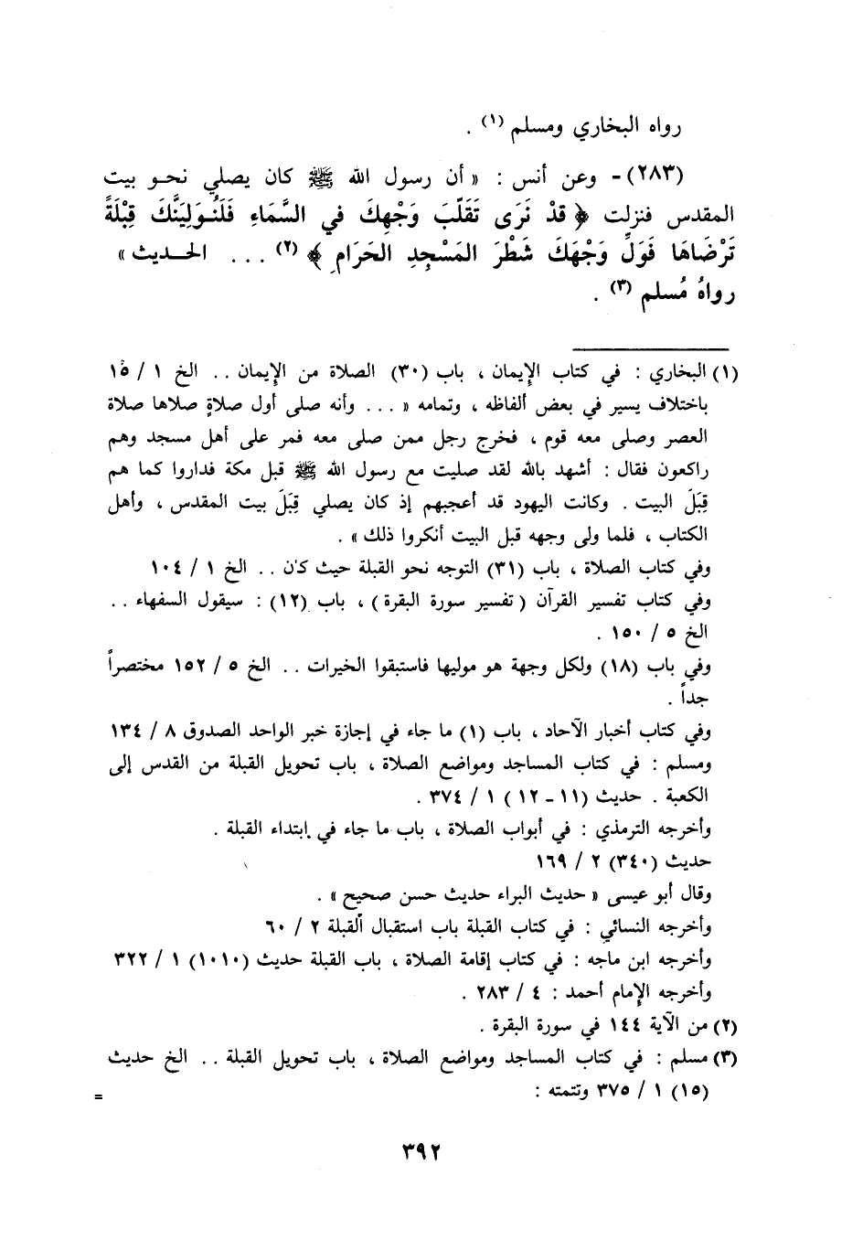 (283) وَعَن أنس أَن رَسُول الله صَلَّى اللَّهُ عَلَيْهِ وَسَلَّم َ كَانَ يُصَلِّي نَحْو بَيت الْمُقَدّس فَنزلت { قد نرَى تقلب وَجهك فِي السَّمَاء فلنولينك قبْلَة ترضاها فول وَجهك شطر الْمَسْجِد الْحَرَام } الحَدِيث رَوَاهُ مُسلم