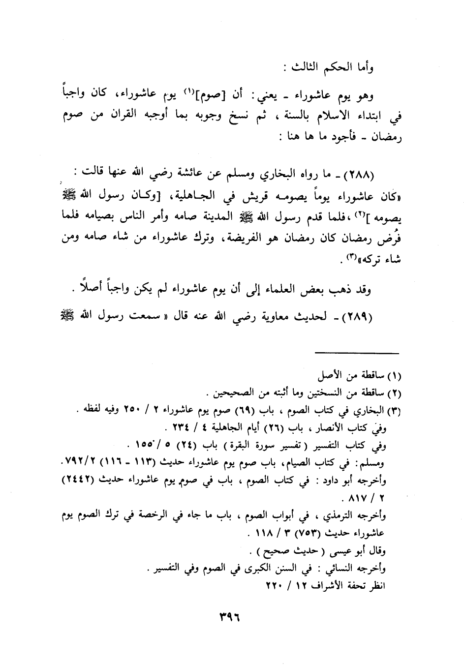 (288) مَا رَوَاهُ البُخَارِيّ وَمُسلم عَن عَائِشَة رَضِيَ اللَّهُ عَنْها قَالَت كَانَ عَاشُورَاء يَوْمًا يَصُومهُ قُرَيْش فِي الْجَاهِلِيَّة وَكَانَ رسو الله صَلَّى الله عَلَيْهِ 0 وَسلم يَصُومهُ فَلَمَّا قدم رَسُول الله صَلَّى اللَّهُ عَلَيْهِ وَسَلَّم َ الْمَدِينَة صَامَهُ وَأمر النَّاس بصيامه فَلَمَّا فرض رَمَضَان كَانَ رَمَضَان هُوَ الْفَرِيضَة وَترك عَاشُورَاء من شَاءَ صَامَهُ وَمن شَاءَ تَركه وَقد ذهب بعض الْعلمَاء إِلَى أَن يَوْم عَاشُورَاء لم يكن وَاجِبا اصلا