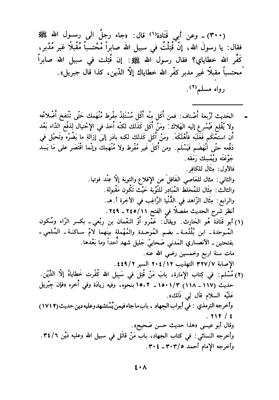 (300) وَعَن ابي قَتَادَة قَالَ جَاءَ رجل الى رَسُول الله صَلَّى اللَّهُ عَلَيْهِ وَسَلَّم َ فَقَالَ يَا رَسُول الله إِن قتلت فِي سَبِيل الله صَابِرًا محتسبا مُقبلا غير مُدبر كفر الله خطاياي فَقَالَ رَسُول الله صَلَّى اللَّهُ عَلَيْهِ وَسَلَّم َ إِن قتلت فِي سَبِيل الله صَابِرًا محتسبا مُقبلا غير مُدبر كفر الله خطاياك إِلَّا الدَّين كَذَا قَالَ جِبْرِيل رَوَاهُ مُسلم