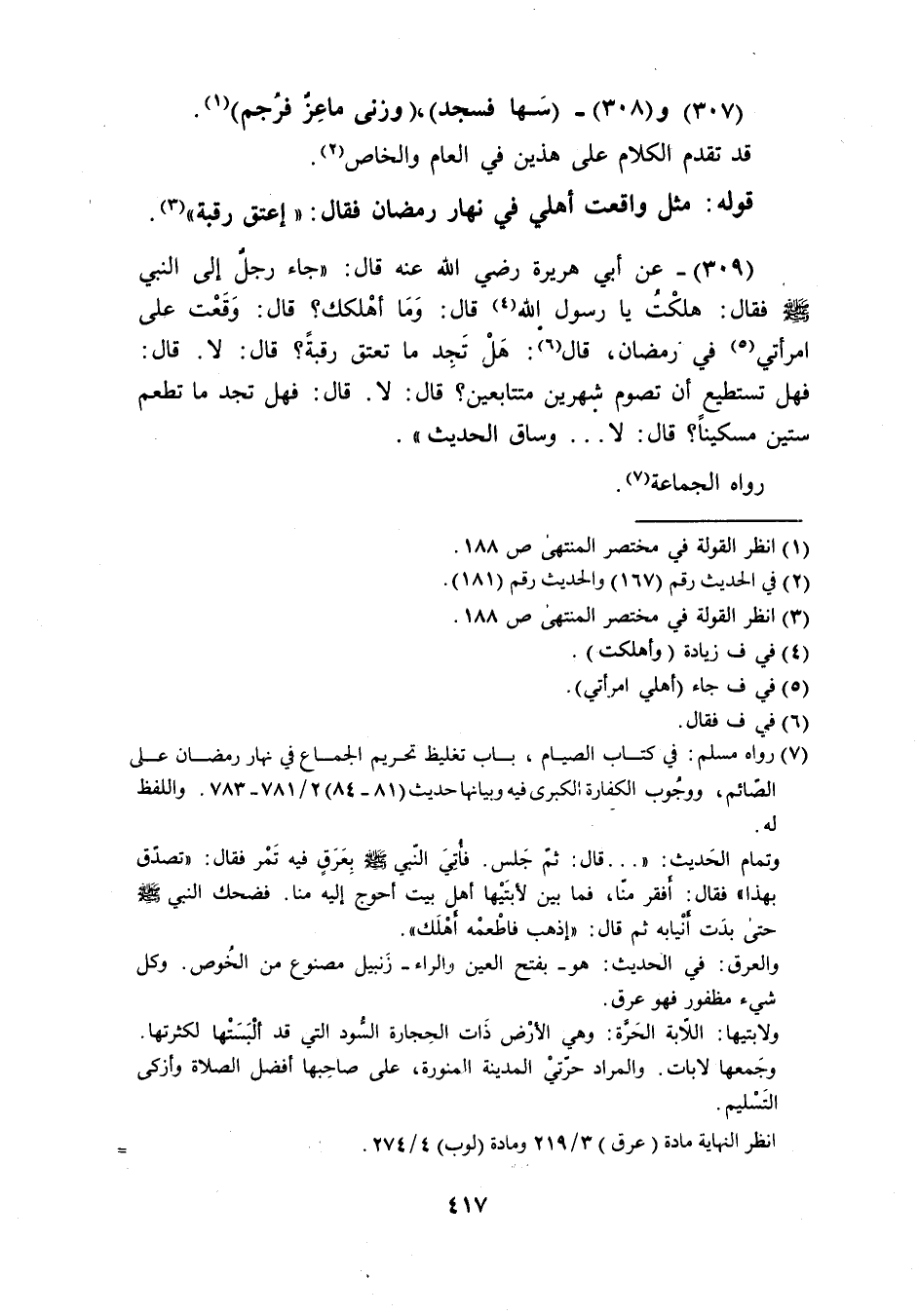 (309) عَن أبي هُرَيْرَة رَضِيَ اللَّهُ عَنْه قَالَ جَاءَ رجل الى النَّبِي صَلَّى اللَّهُ عَلَيْهِ وَسَلَّم َ فَقَالَ هَلَكت يَا رَسُول الله قَالَ وَمَا أهْلكك قَالَ وَقعت عَلَى امْرَأَتي فِي رَمَضَان قَالَ هَل تحد مَا تعْتق رَقَبَة قَالَ لَا قَالَ فَهَل تَسْتَطِيع أَن تَصُوم شَهْرَيْن مُتَتَابعين قَالَ لَا قَالَ فَهَل تَجِد مَا تطعم سِتِّينَ مِسْكينا قَالَ لَا وسَاق الحَدِيث رَوَاهُ الْجَمَاعَة