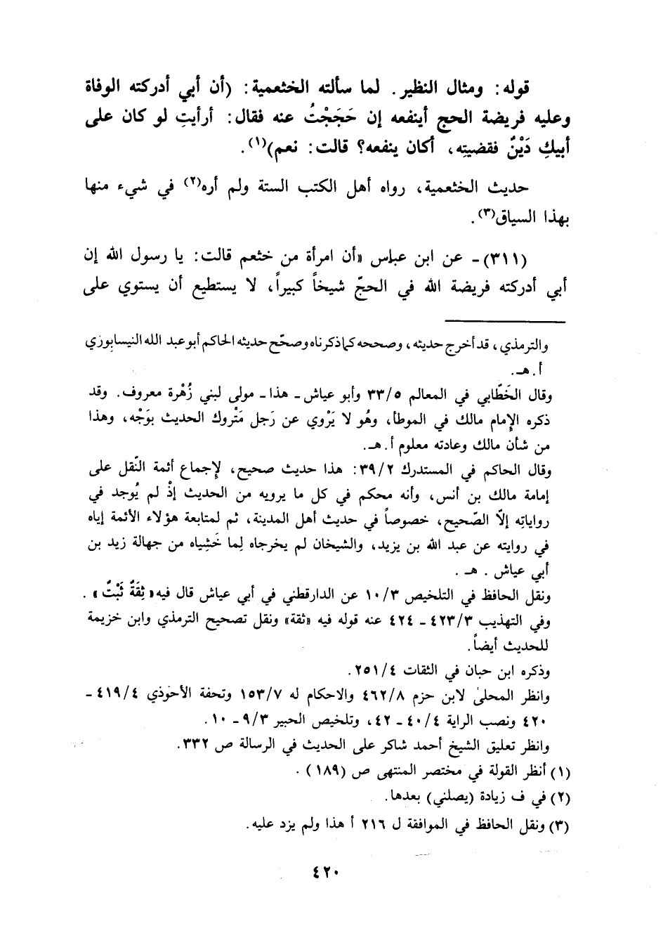(311) عَن ابْن عَبَّاس أَن امْرَأَة من خثعم قَالَ يَا رَسُول الله إِن ابي أَدْرَكته فَرِيضَة الله فِي الْحَج شَيخا كَبِيرا لَا يَسْتَطِيع أَن يَسْتَوِي عَلَى