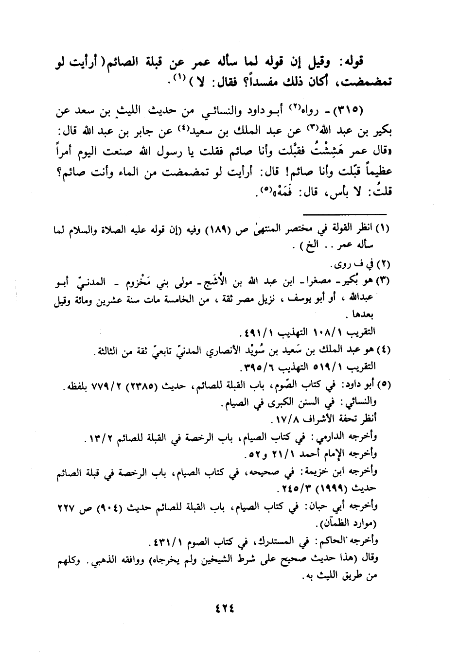 (315) رَوَاهُ أَبُو دَاوُد وَالنَّسَائِيّ من حَدِيث اللَّيْث بن سعد عَن بكير بن عبد الله عَن عبد الْملك بن سعيد عَن جَابر بن عبد الله قَالَ قَالَ عمر هششت فَقبلت وانا صَائِم فَقلت يَا رَسُول الله صنعت الْيَوْم أمرا عَظِيما قبلت وَأَنا صَائِم قَالَ أَرَأَيْت لَو تمضمضت من المَاء وَأَنت صَائِم قلت لَا بَأْس قَالَ فَمه