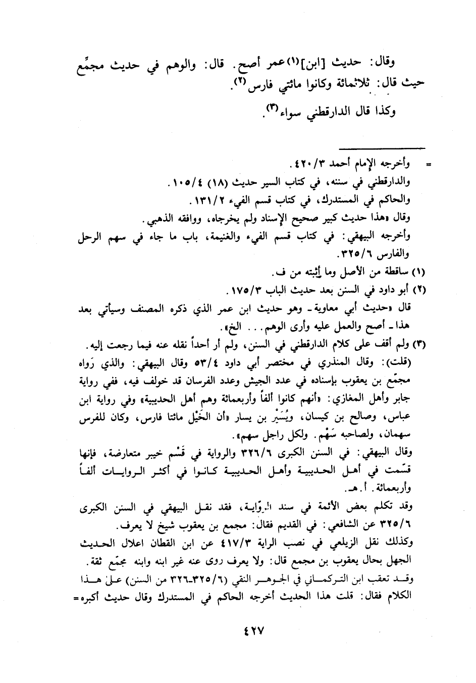 وَقَالَ حَدِيث ابْن عمر اصح قَالَ وَالوهم فِي حَدِيث مجمع حَيْثُ قَالَ ثَلَاثمِائَة وَكَانُوا مِائَتي فَارس وَكَذَا قَالَ الدَّارَقُطْنِيّ سَوَاء