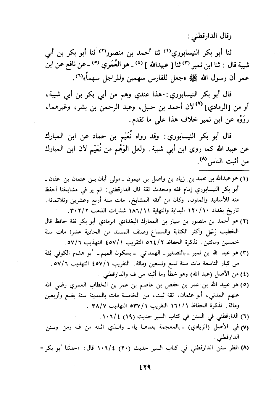 ثَنَا أَبُو بكر النَّيْسَابُورِي ثَنَا أَحْمد بن مَنْصُور ثَنَا أَبُو بكر بن ابي شيبَة قَالَ ثَنَا ابْن نمير ثَنَا عبيد الله هُوَ الْعمريّ عَن نَافِع عَن ابْن عمر أَن رَسُول الله صَلَّى اللَّهُ عَلَيْهِ وَسَلَّم َ جعل لفارس سَهْمَيْنِ وللراجل سَهْما