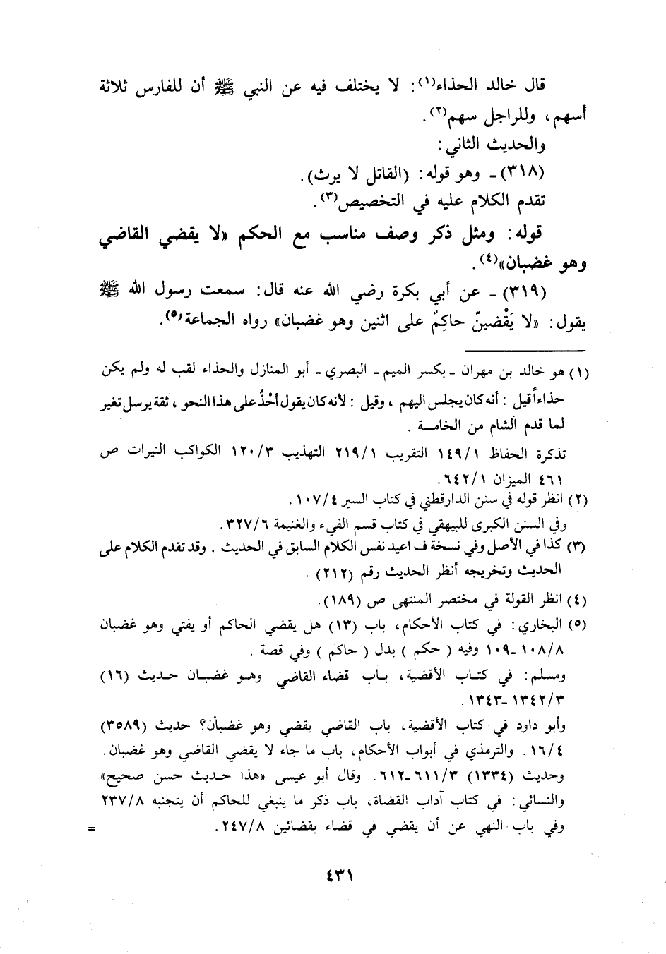 (319) عَن أبي بكرَة رَضِيَ اللَّهُ عَنْه قَالَ سَمِعت رَسُول الله صَلَّى اللَّهُ عَلَيْهِ وَسَلَّم َ يَقُول لَا يقضين حَاكم عَلَى اثْنَيْنِ وَهُوَ غَضْبَان رَوَاهُ الْجَمَاعَة