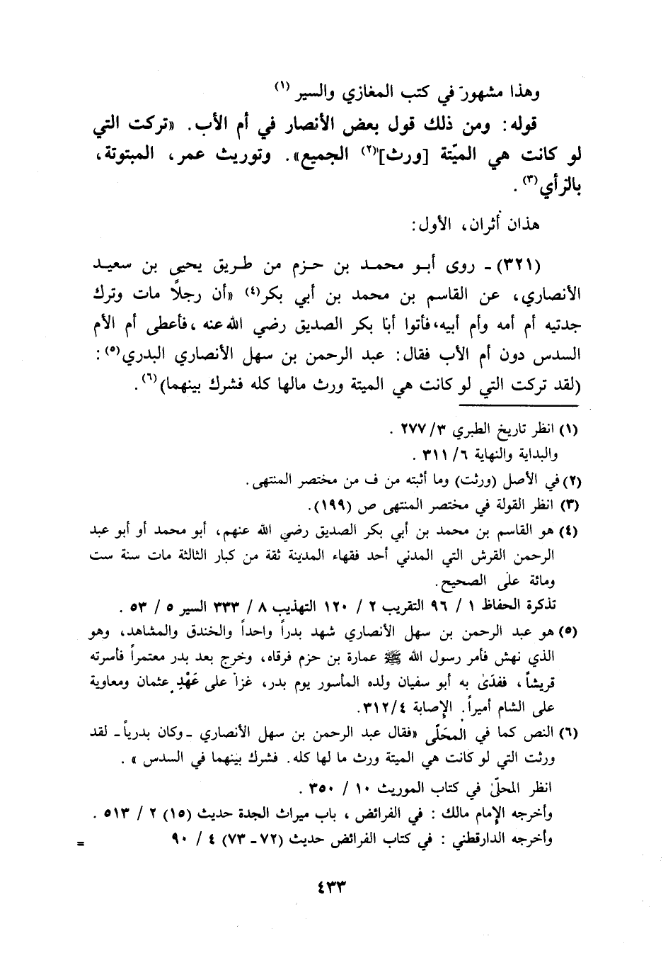 (321) رَوَى أَبُو مُحَمَّد بن حزم من طَرِيق يحي بن سعيد الانصاري عَن الْقَاسِم بن مُحَمَّد بن أبي بكر أَن رجلا مَاتَ وَترك جدتيه أم أمه وَأم أَبِيه فَأتوا ابا بكر الصّديق رَضِيَ اللَّهُ عَنْه فَأعْطَى أم الْأُم السُّدس دون أم اللأب فَقَالَ عبد الرَّحْمَن بن سهل الانصاري البدري لقد تركت الَّتِي لَو كَانَت هِيَ الْميتَة ورث مَالهَا كُله فشرك بَينهمَا