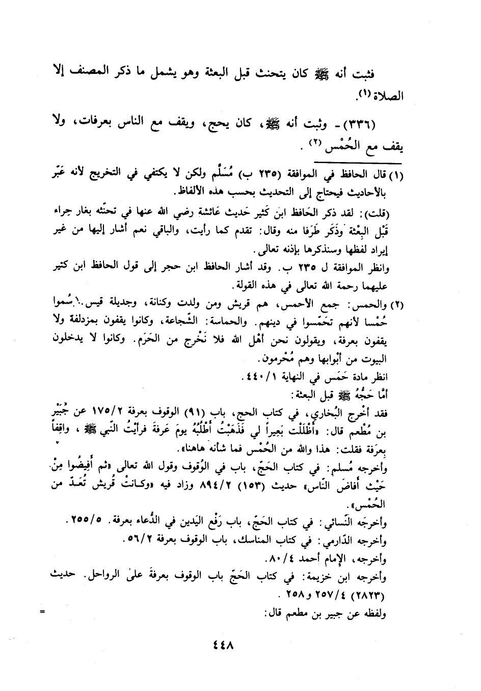 (336) وَثَبت أَنه صَلَّى اللَّهُ عَلَيْهِ وَسَلَّم َ كَانَ يحجّ وَيقف مَعَ النَّاس بِعَرَفَات وَلَا يقف مَعَ الحمس