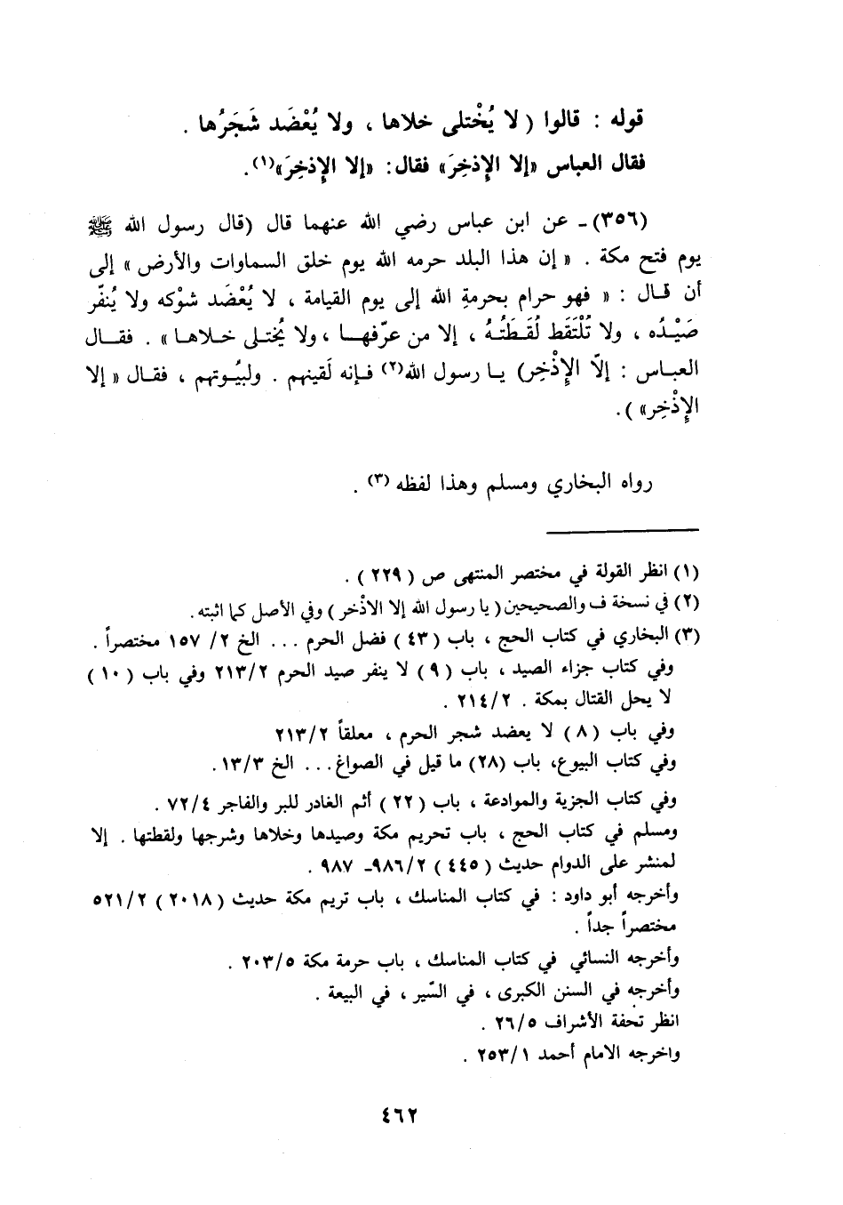 (356) عَن ابْن عَبَّاس رَضِيَ اللَّهُ عَنْهما قَالَ قَالَ رَسُول الله صَلَّى اللَّهُ عَلَيْهِ وَسَلَّم َ يَوْم فتح مَكَّة إِن هَذَا الْبَلَد حرمه الله يَوْم خلق السَّمَاوَات والارض الى ان قَالَ فَهُوَ حرَام بِحرْمَة الله الى يَوْم الْقِيَامَة لَا يعضد شوكه وَلَا ينفر صَيْده وَلَا تلْتَقط لقطته إِلَّا من عرفهَا وَلَا يُخْتَلَى خَلاهَا فَقَالَ الْعَبَّاس إِلَّا الاذخر يَا رَسُول الله فانه لِقَيْنِهِم ولبيوتهم فَقَالَ إِلَّا الاذخر