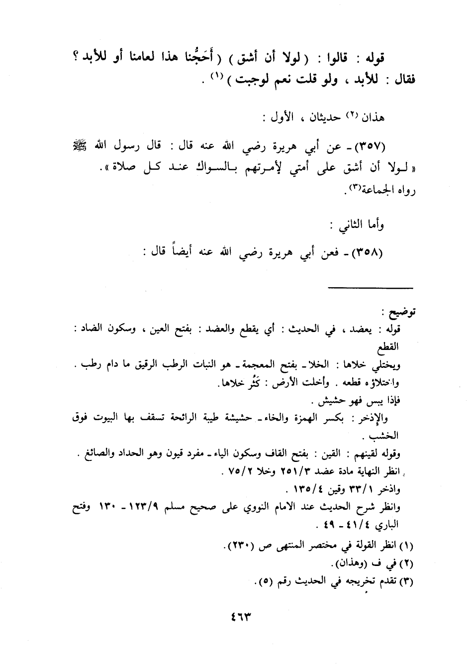 (357) عَن أبي هُرَيْرَة رَضِيَ اللَّهُ عَنْه قَالَ قَالَ رَسُول الله صَلَّى اللَّهُ عَلَيْهِ وَسَلَّم َ وَلَوْلَا أَن أشق عَلَى أمتِي لامرتهم بِالسِّوَاكِ عِنْد كل صَلَاة رَوَاهُ الْجَمَاعَة