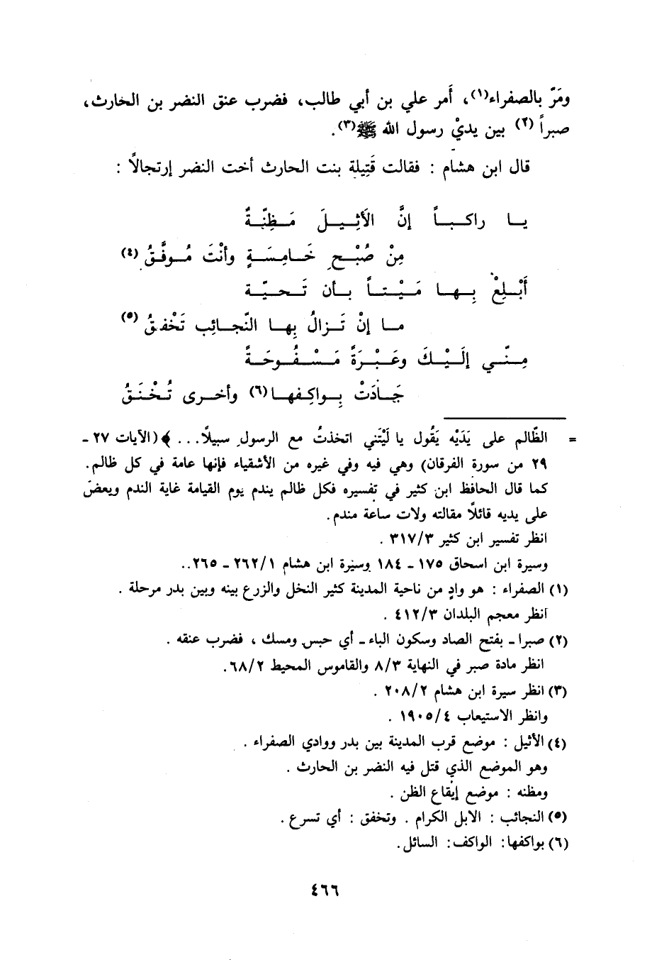 وَمر بالصفراء أَمر عَلّي بن أبي طَالب فَضرب عنق النَّضر بن الْحَارِث صبرا بَين يَدي رَسُول الله صَلَّى اللَّهُ عَلَيْهِ وَسَلَّم َ قَالَ ابْن هَاشم فَقَالَت قتيلة بنت الْحَارِث أُخْت النَّضر إرتجالا ... يَا رَاكِبًا إِن الاثيل مظنه ... ... من صبح خَامِسَة وَأَنت موفق ... ... أبلع بهَا مَيتا بِأَن تَحِيَّة ... ... مَا إِن تزَال بهَا النجائب تخفق ... ... مني إِلَيْك وعبرة مسفوحة ... ... جَادَتْ بواكفها وَأُخْرَى تخنق ... ...