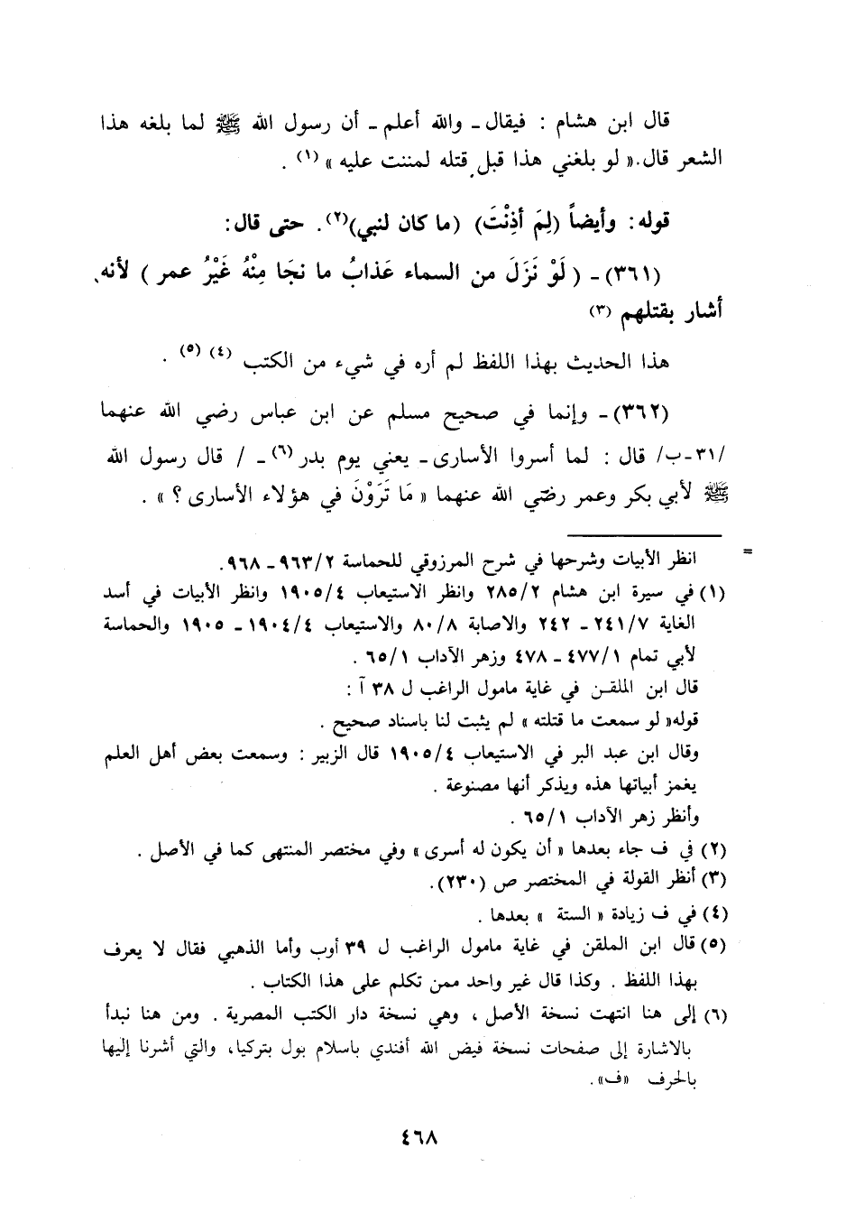 قَالَ ابْن هَاشم فَيُقَال وَالله أعلم أَن رَسُول الله صَلَّى اللَّهُ عَلَيْهِ وَسَلَّم َ لما بلغه هَذَا الشّعْر قَالَ لَو بَلغنِي هَذَا قبل قَتله لمننت عَلَيْهِ