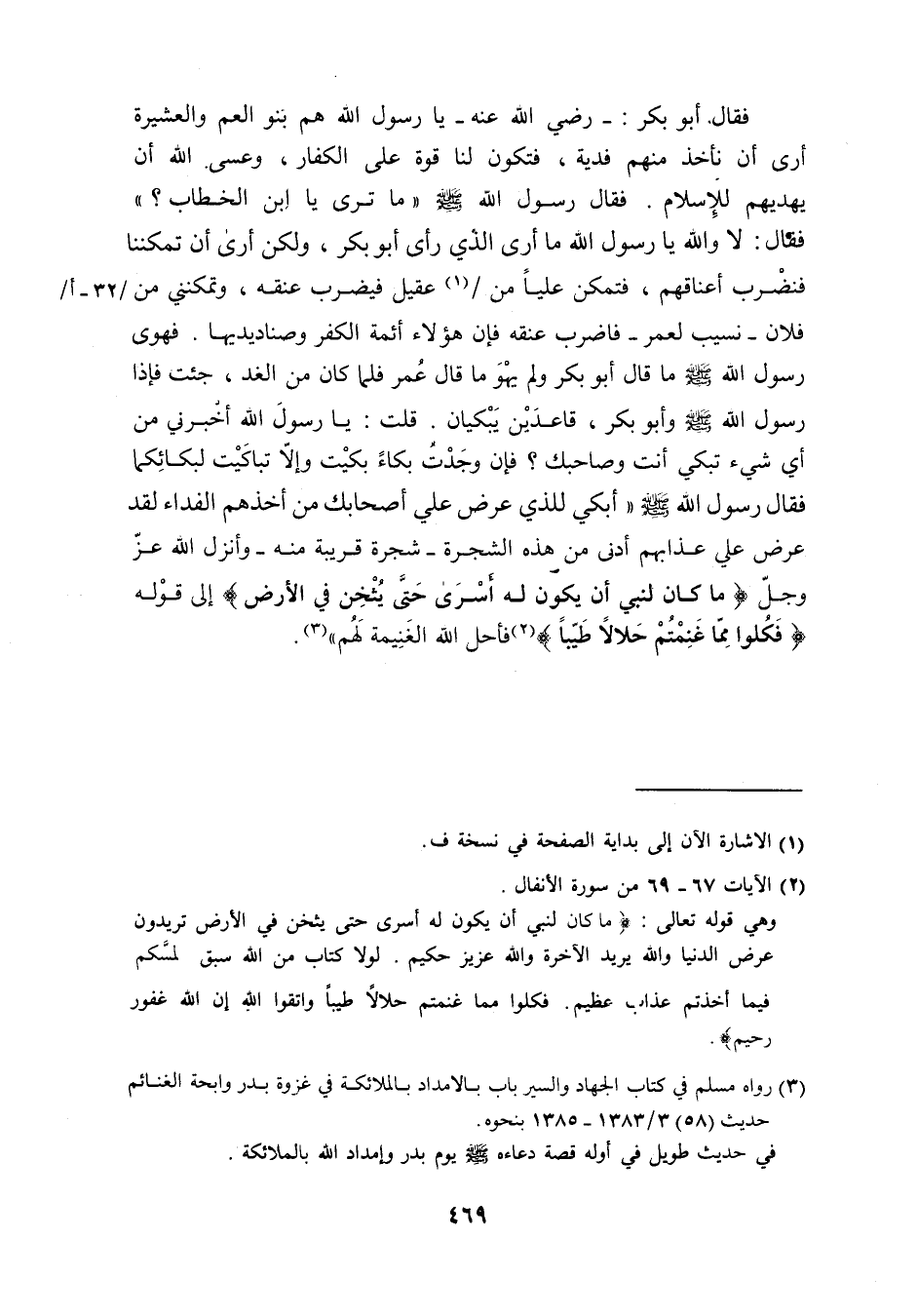 فَقَالَ أَبُو بكر رَضِيَ اللَّهُ عَنْه يَا رَسُول الله هم بَنو الْعم وَالْعشيرَة أرَى أَن نَأْخُذ مِنْهُم فديَة فَتكون لنا قُوَّة عَلَى الْكفَّار وَعَسَى الله أَن يهْدِيهم للاسلام فَقَالَ رَسُول الله صَلَّى اللَّهُ عَلَيْهِ وَسَلَّم َ مَا ترَى يَا ابْن الْخطاب فَقَالَ لَا وَالله يَا رَسُول الله مَا أرَى الَّذِي رَأْي أَبُو بكر وَلَكِن أرَى أَن تمكننا فَنَضْرِب أَعْنَاقهم فَتمكن عليا من عقيل فَيضْرب عُنُقه وتمكنني من 32 أ فلَان نسيب لعمرر فَاضْرب عُنُقه فَإِن هَؤُلَاءِ أَئِمَّة الْكفْر وصنادين بهَا فهوى رَسُول الله صَلَّى اللَّهُ عَلَيْهِ وَسَلَّم َ مَا قَالَ أَبُو بكر وَلم يَهو مَا قَالَ عمر فَلَمَّا كَانَ من الغذ جِئْت فَإِذا رَسُول الله صَلَّى اللَّهُ عَلَيْهِ وَسَلَّم َ وابو بكر قَاعِدين يَبْكِيَانِ قلت يَا رَسُول الله أَخْبرنِي من أَي شَيْء تبْكي أَنْت وَصَاحِبك فَإِن وجدت بكاء بَكَيْت وإغلا تباكيث لِبُكَائِكُمَا فَقَالَ رَسُول الله صَلَّى اللَّهُ عَلَيْهِ وَسَلَّم َ أبْكِي للَّذي عرض عَلّي أَصْحَابك من أَخذهم الْفِدَاء لقد عرض عَلّي عَذَابهمْ أدنَى من هَذِه الشَّجَرَة شَجَرَة قريبَة مِنْهُ وَأنزل الله عَزَّ وَجَلَّ { مَا كَانَ لنَبِيّ أَن يكون لَهُ أَسْرَى حَتَّى يثخن فِي الأَرْض } إِلَى قَوْله { فَكُلُوا مِمَّا غَنِمْتُم حَلَالا طيبا } فأحل الله الْغَنِيمَة لَهُم