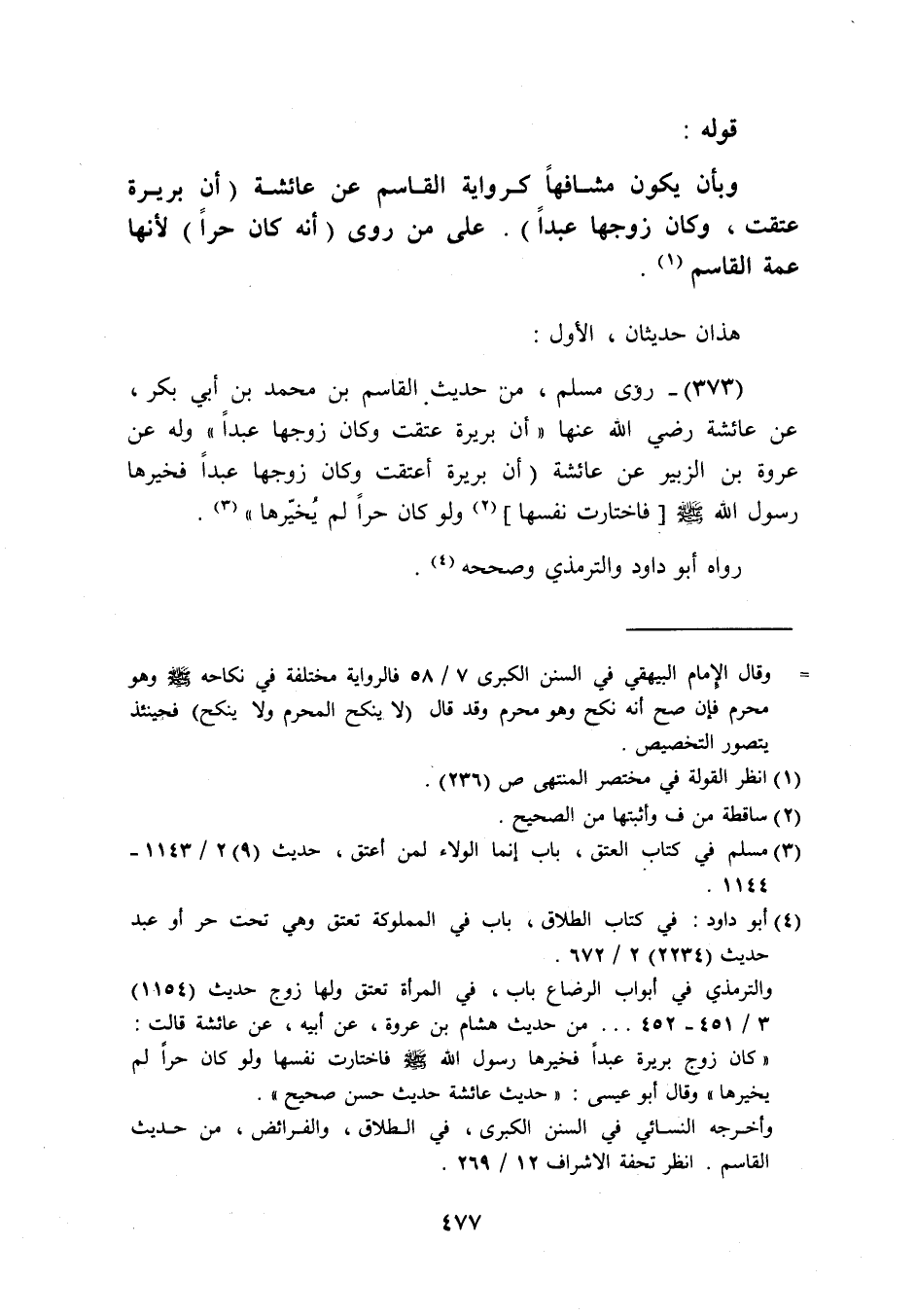 هَذَانِ حديثان الاول (373) رَوَى مُسلم من حَدِيث الْقَاسِم بن مُحَمَّد بن أبي بكر عَن عَائِشَة رَضِيَ اللَّهُ عَنْها أَن بَرِيرَة عتقت وَكَانَ زَوجهَا عبدا وَله عَن عُرْوَة بن الزبير عَن عَائِشَة أَن بَرِيرَة أعتقت وَكَانَ زَوجهَا عبدا فَخَيرهَا رَسُول الله صَلَّى اللَّهُ عَلَيْهِ وَسَلَّم َ فَاخْتَارَتْ نَفسهَا وَلَو كَانَ حرا لم يخيرها رَوَاهُ أَبُو دَاوُد وَالتِّرْمِذِيّ وَصَححهُ